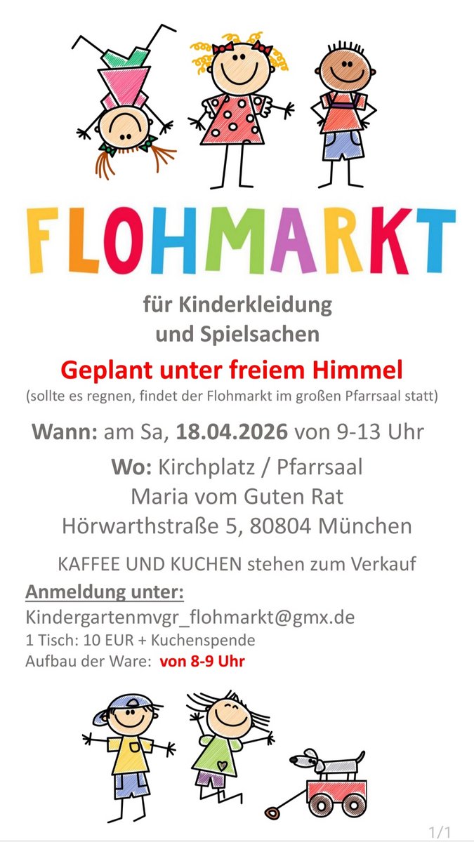 AdresseKirchplatz Maria vom Guten RatHörwarthstr. 5,, 80804 Schwabing-FreimannUnser beliebter Flohmarkt rund ums Kind Mit Kaffee- und Kuchenverkauf..weitere InformationenUnser beliebter Flohmarkt rund ums KindDetails & Kontakt
