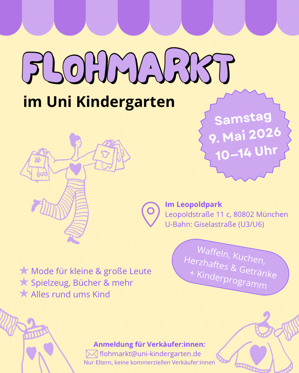 AdresseUni-KindergartenLeopoldstraße 11c, 80802 MünchenFlohmarkt im Uni Kindergarten: Bei gutem Wetter im Garten, bei schlechtem Wetter drinnen Mode für kleine &..weitere InformationenFlohmarkt im Uni Kindergarten:Details & Kontakt