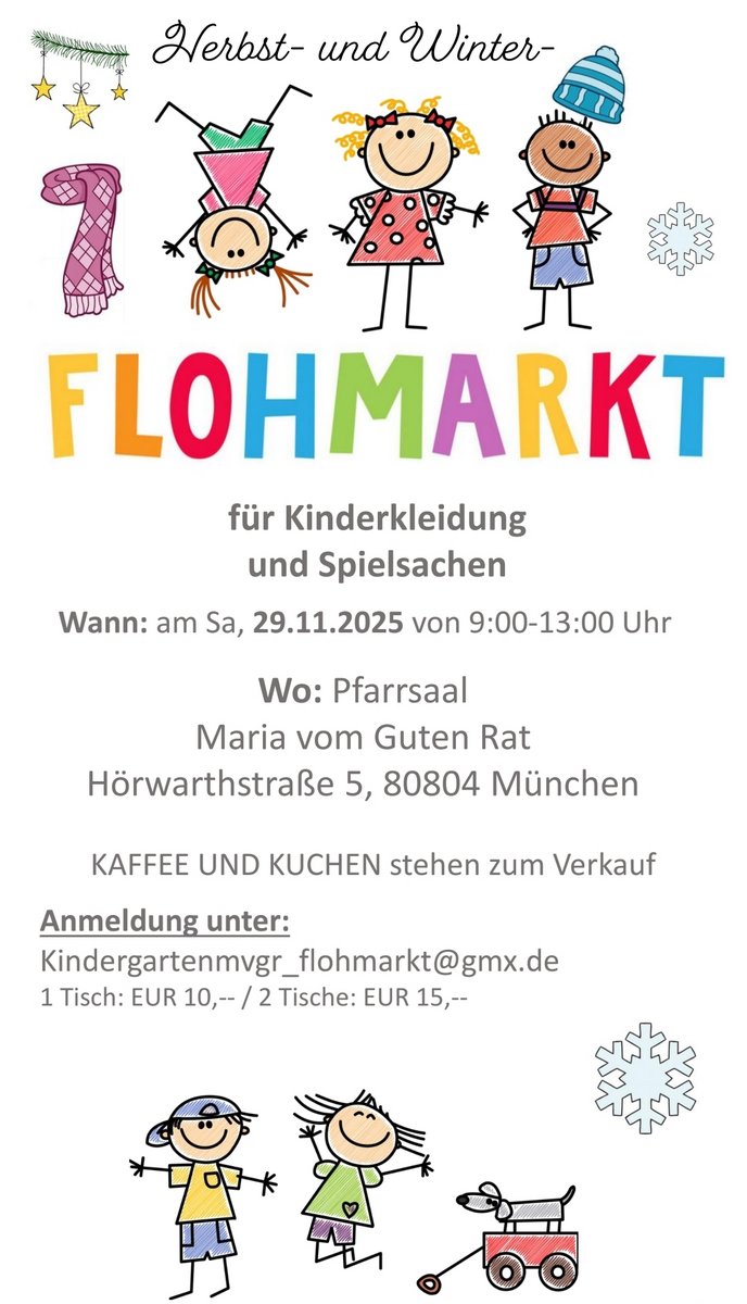 AdresseKindergarten Maria vom guten RatHörwarthstr 5, 80803 München SchwabingVerkauf von Kinderkleidung und Spielwaren Kaffee und Kuchen..weitere InformationenVerkauf von Kinderkleidung und SpielwarenDetails & Kontakt