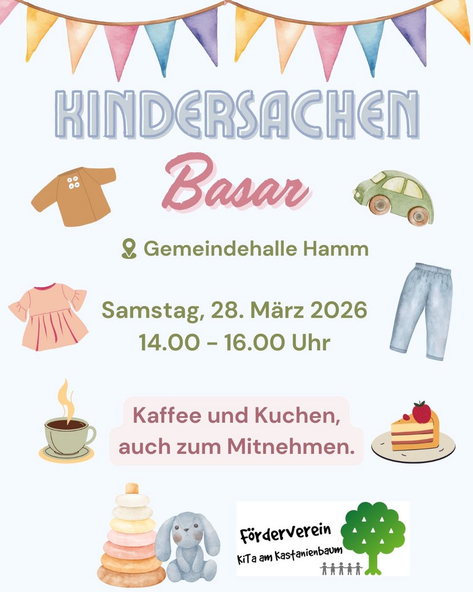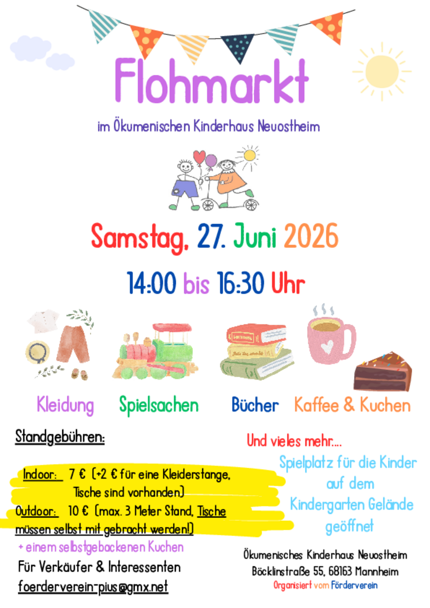 Jetzt schon im Kalender vormerken oder anmelden. Wir freuen uns auf euch!KontaktVerkäufer-Anmeldung und weitere Infos unter elternbeirat@diekleinenschelme.deKontakt mit dem Organisator aufnehmen - KinderflohmarktPfarrzentrum St. Teresa