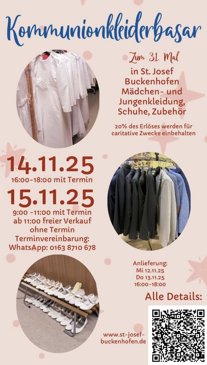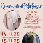 Informationen siehe Flyer oder st-josef-buckenhofen.de/aktuelles-001/nachrichten/kommunionkleiderbasar-2025-in-st-josef/12a87e90-d4c9-4b13-8982-38cea108d1c5?mode=detailKontaktTerminvergabe unter 0163)8710678
