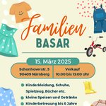 AdresseChristliche Gemeinde NürnbergSchonhoverstraße 5, 90409 NürnbergHerzliche Einladung zum Familienbasar am 14.03.2026 von 10-13 Uhr. Verkauft werden Kinderkleidung, Schuhe, Spielzeug ..weitere InformationenHerzliche Einladung zum Familienbasar am 14.03.2026 von 10-13 Uhr.Details