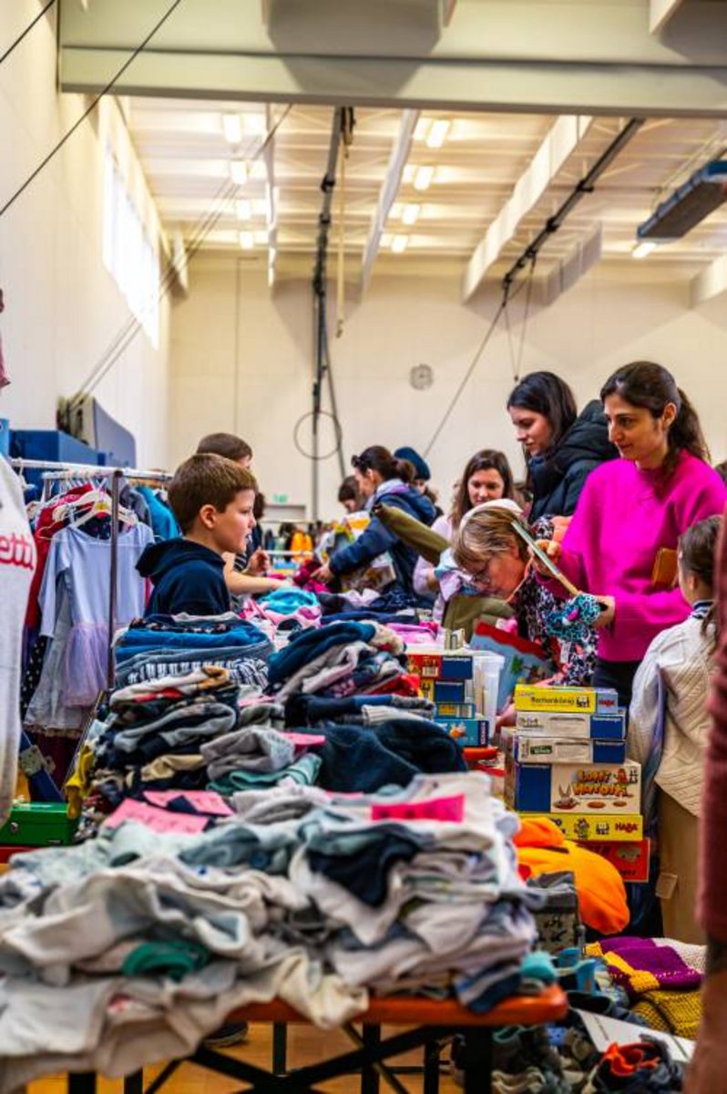 Auf so einem Flohmarkt oder Basar kannst Du gebrauchte Kindersachen 👕, -artikel 🛼, Spielzeug 🎲 und weitere Second-Hand-Ausstattung 📚