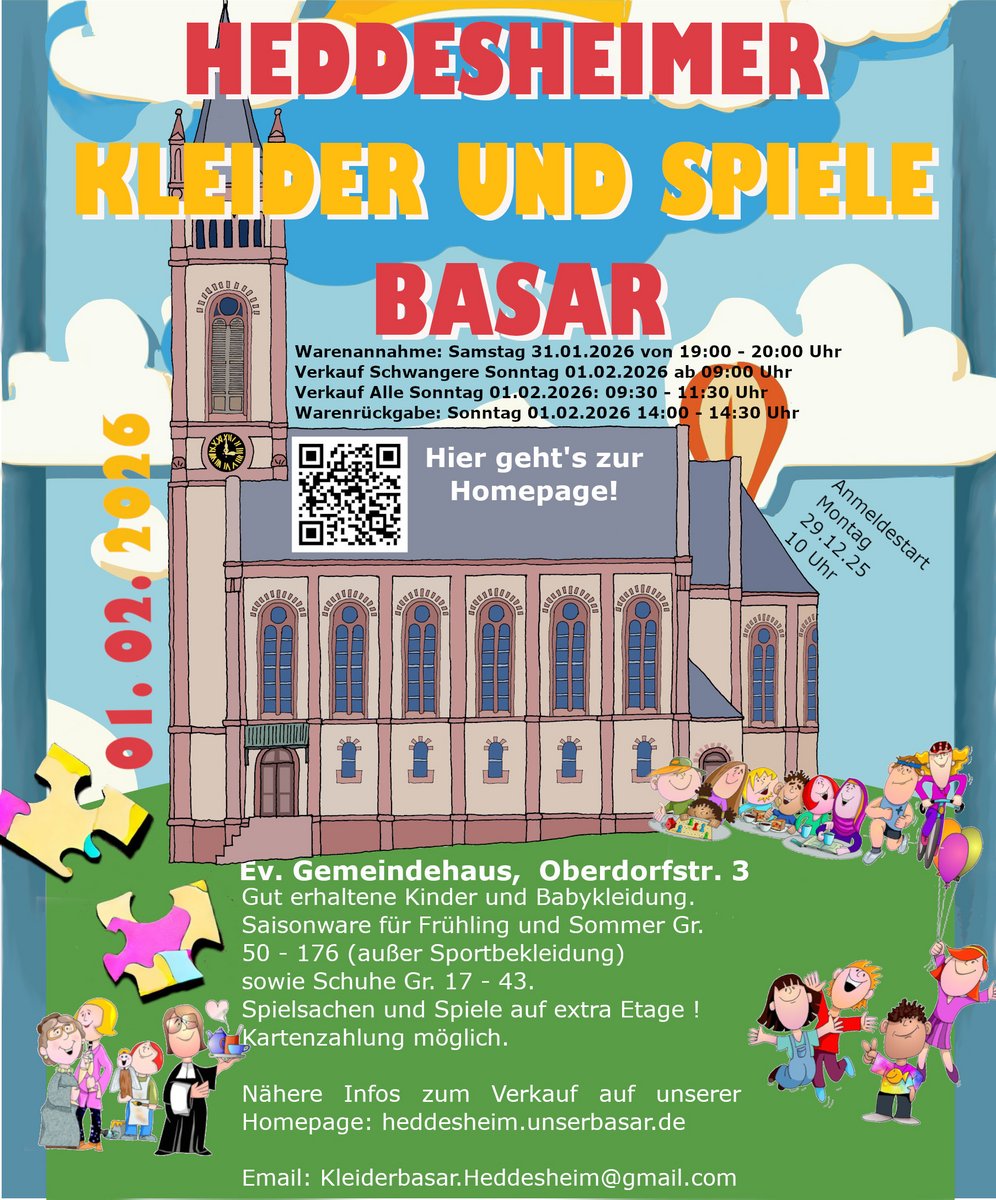 Adresseev. Gemeindehaus HeddesheimOberdorfstr. 3, 68542 HeddesheimAm 01.02.2026 findet zum 7. Mal unser Basar im ev. Gemeindehaus statt. Dort findet ihr Kinderkleidung für Früh..weitere InformationenAm 01.02.2026 findet zum 7. Mal unser Basar im ev. Gemeindehaus statt. Dort findet ihr Kinderkleidung für Frühling & Sommer von Größe 50 - 140 alles schön sortiert nach Größen.Details & Kontakt