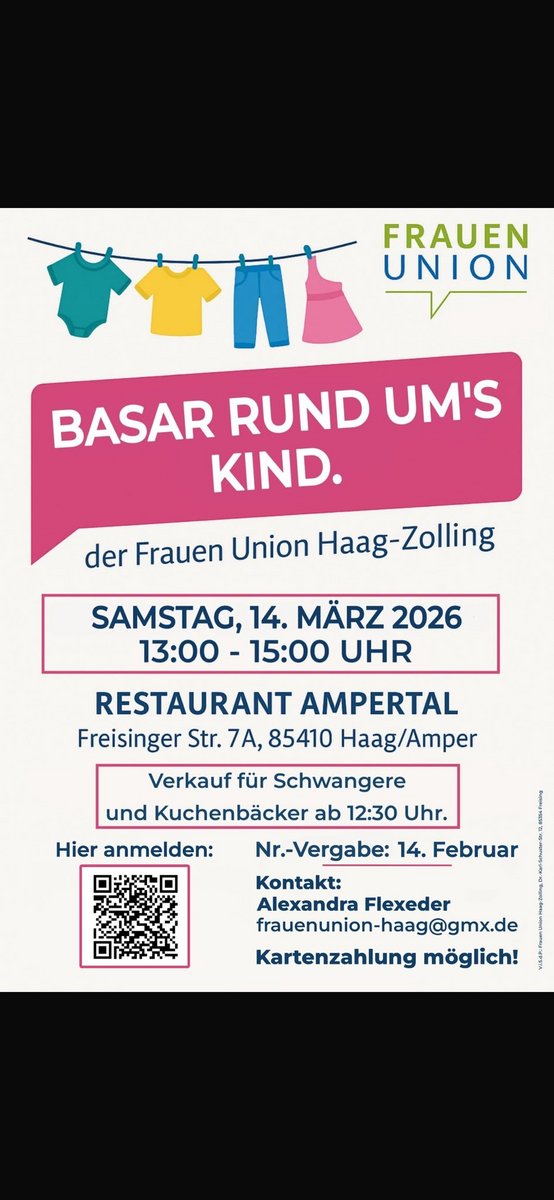 Donnerstag, 05. März 2026: Verkauf aller Artikel von 9.00 bis 12.00 Uhr und von 16.30 bis 18.00 Uhr (für Schwangere bereits ab 16 Uhr!)KontaktAnmeldungKontakt mit dem Organisator aufnehmen