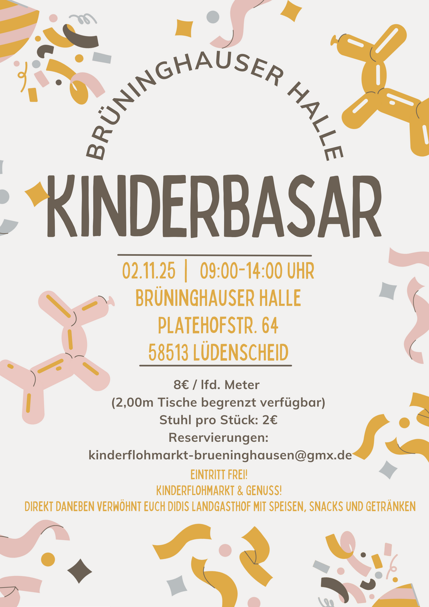 Adresseehemalige Brüninghauser Halle LüdenscheidPlatehofstraße 64, 58513 Lüdenscheid BrüninghausenAm 02.11.2025 findet von 9:00-14:00 Uhr unser diesjähriger Kinderflohmarkt in der Brüninghauser Halle statt. ..weitere InformationenAm 02.11.2025 findet von 9:00-14:00 Uhr unser diesjähriger Kinderflohmarkt in der Brüninghauser Halle statt.Details & Kontakt