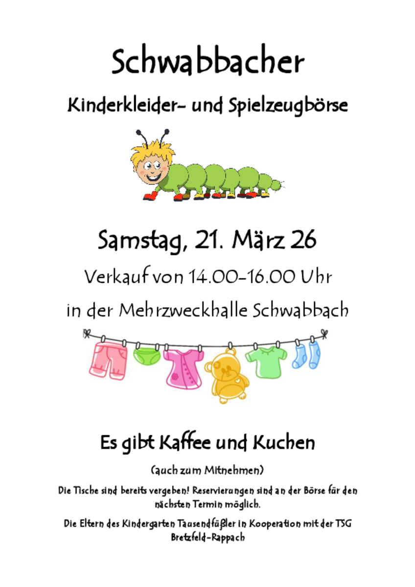 Mit Kuchen- und WaffelverkaufKontaktAnmeldung zum Verkauf über BasarlinoKontakt mit dem Organisator aufnehmen - Alles rund ums KindTSV Turnhalle Großglattbach