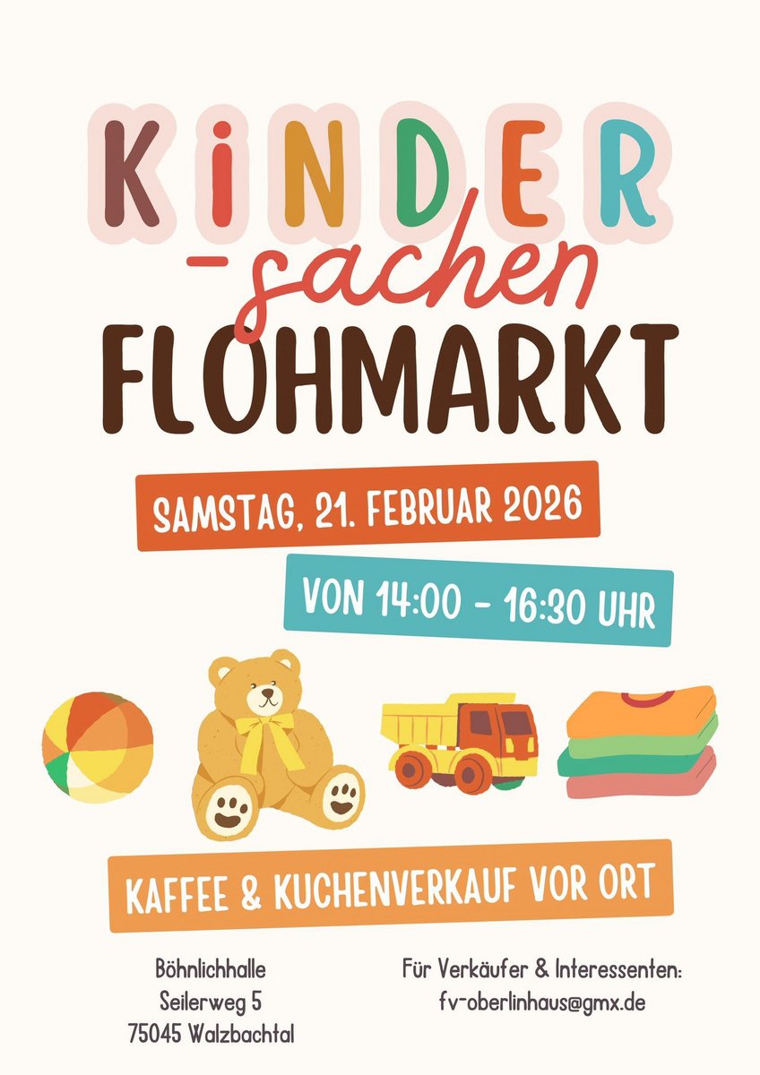 AdresseBöhnlichhalleSeilerweg 5, 75045 Walzbachtal WössingenAm Samstag, den 21. Februar 2026, lädt der Elternbeirat der Kita Oberlinhaus in Wössingen herzlich zum Kinders..weitere InformationenAm Samstag, den 21. Februar 2026, lädt der Elternbeirat der Kita Oberlinhaus in Wössingen herzlich zum Kindersachenflohmarkt in der Böhnlichhalle ein.Details & Kontakt