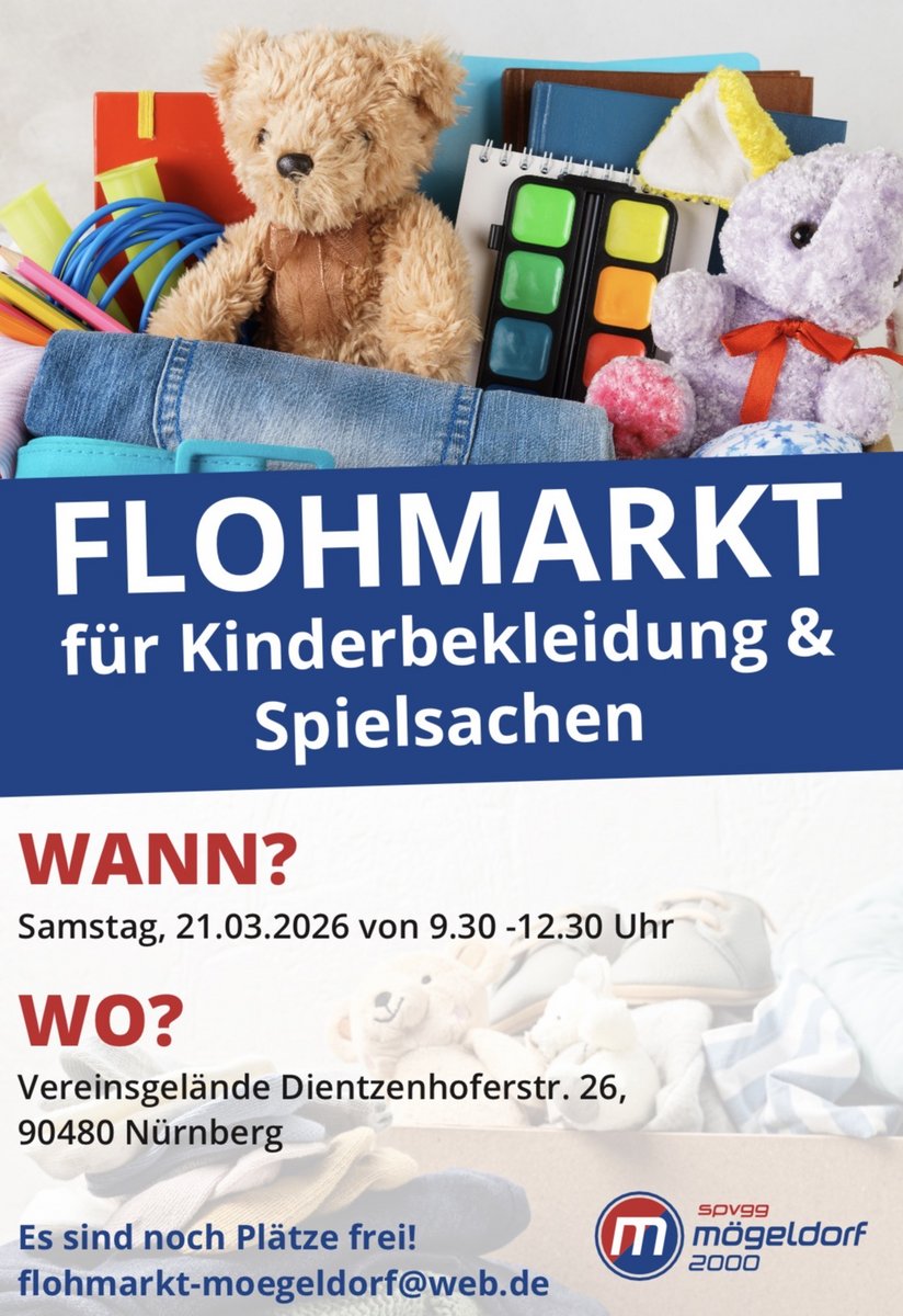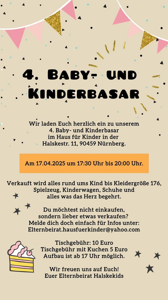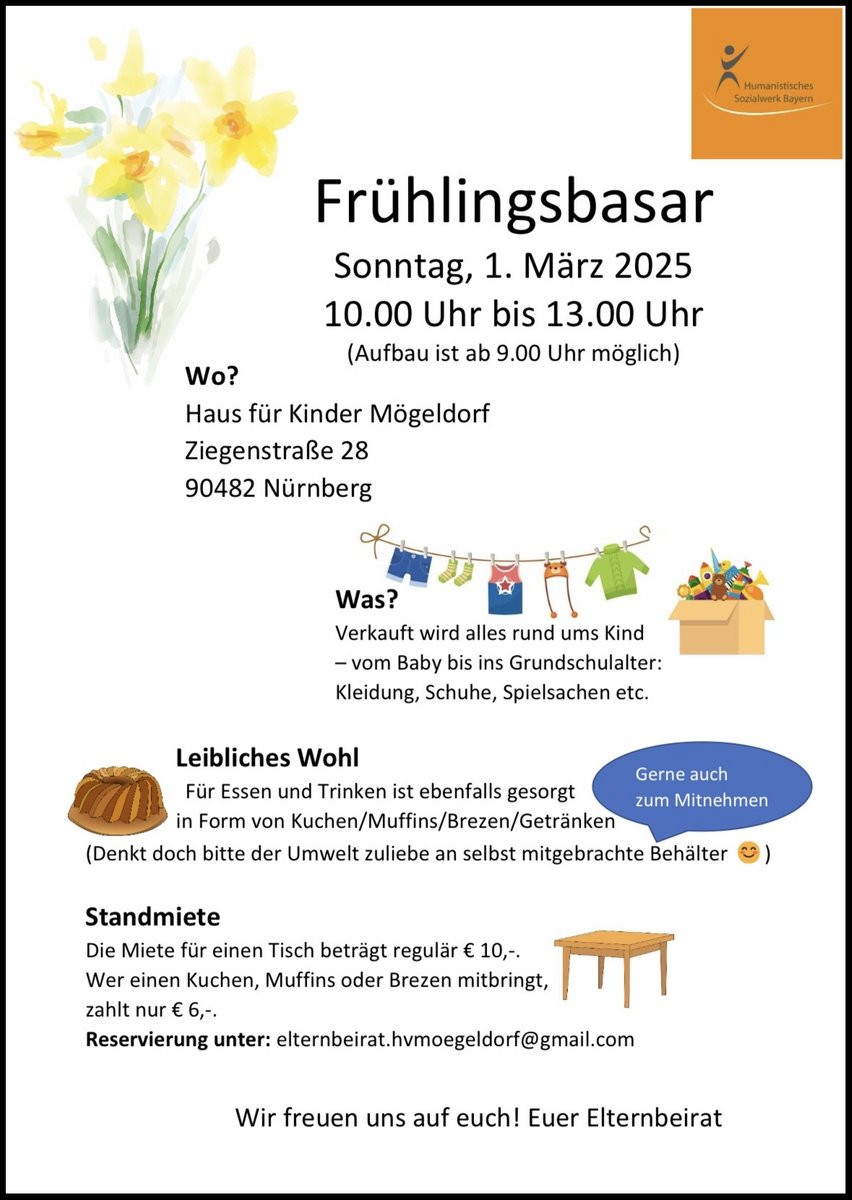 AdresseHaus für Kinder MögeldorfZiegenstraße 28, 90482 Nürnberg MögeldorfAm Sonntag, den 01.03. findet wieder unser Frühlingsbasar im Kindergarten „Haus für Kinder - Mögeld..weitere InformationenAm Sonntag, den 01.03. findet wieder unser Frühlingsbasar im Kindergarten „Haus für Kinder - Mögeldorf“ statt. Verkauft wird alles rund ums Kind!Details & Kontakt