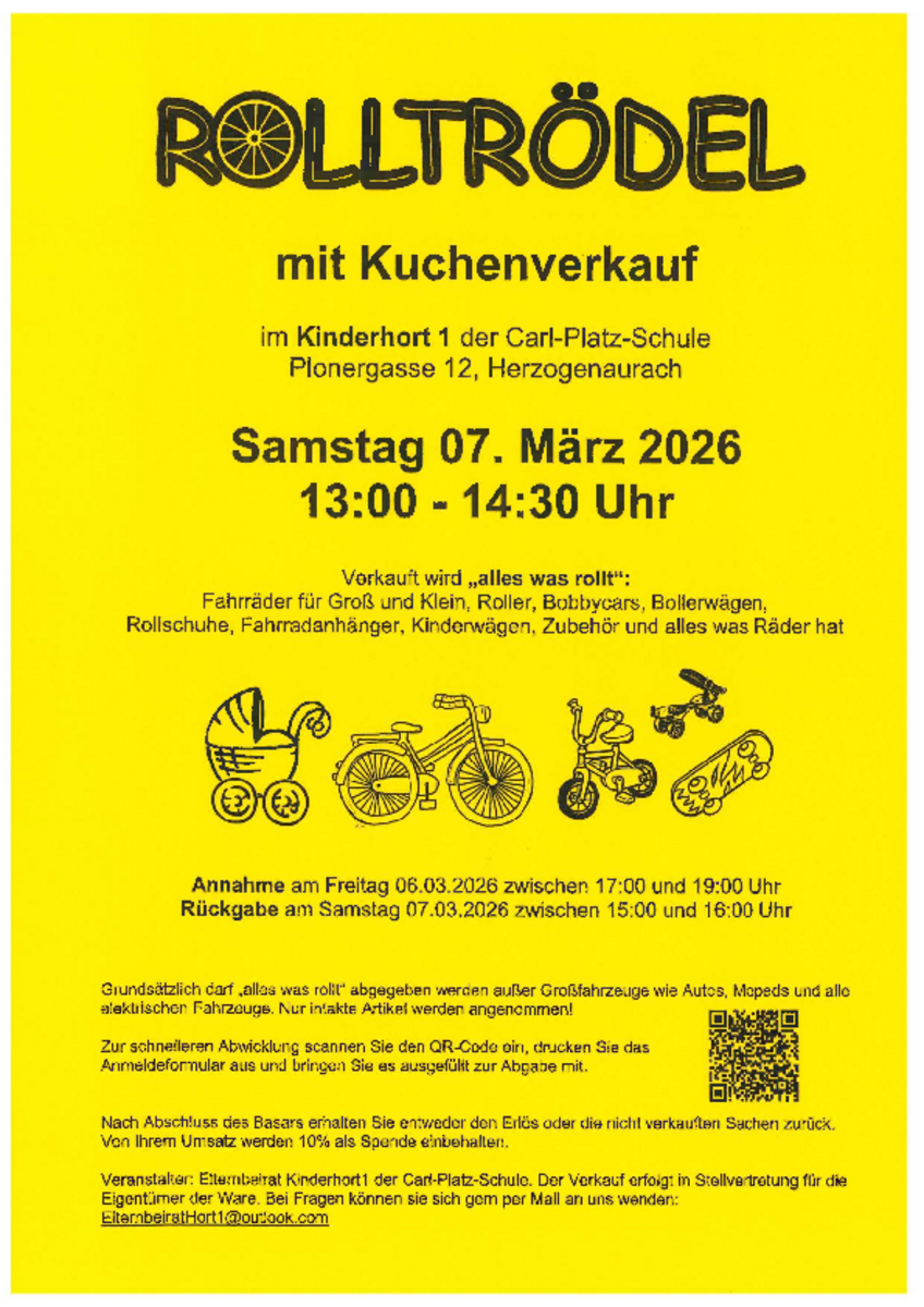 AdresseKinder Hort -Carl-Platz-SchulePlonergasse 12, 91074 Herzogenaurach, 91074 HerzogenaurachRolltrödel mit Kuchenverkauf Verkauft wird "alles was rollt": Fahrräder für Groß und K..weitere InformationenRolltrödel mit KuchenverkaufDetails & Kontakt