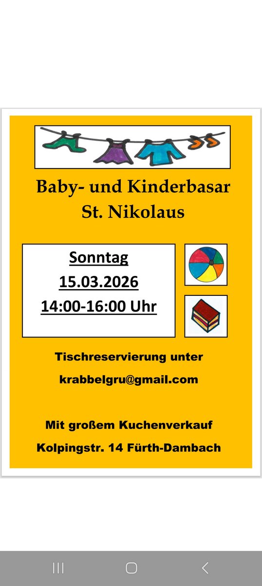 Einlass für Schwangere ab 11:30 Uhr, für alle anderen ab 12 UhrKontaktAnmeldung für Verkäufer über die basarlino AppKontakt mit dem Organisator aufnehmen - Kindersachen FlohmarktSport Kita Champini Nürnberg Zabo