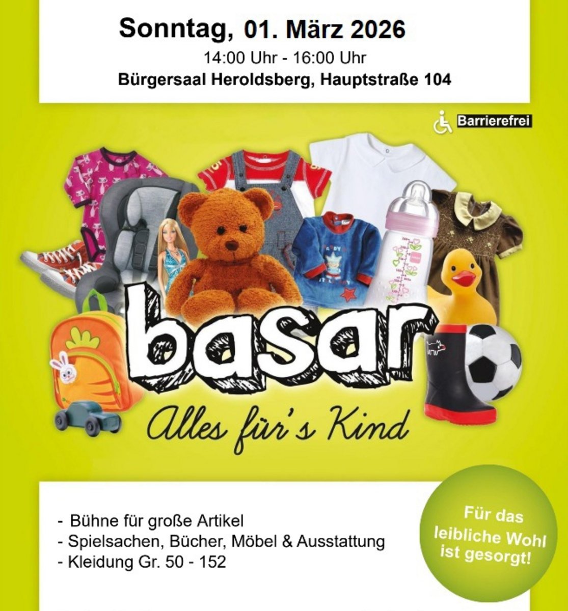 AdresseBürgersaal HeroldsbergHauptstraße 104, 90562 HeroldsbergFrühjahrsbasar der Gründlachzwerge Heroldsberg. Angeboten werden Klamotten von Größe 50 - 152, B&u..weitere InformationenFrühjahrsbasar der Gründlachzwerge Heroldsberg.Details & Kontakt