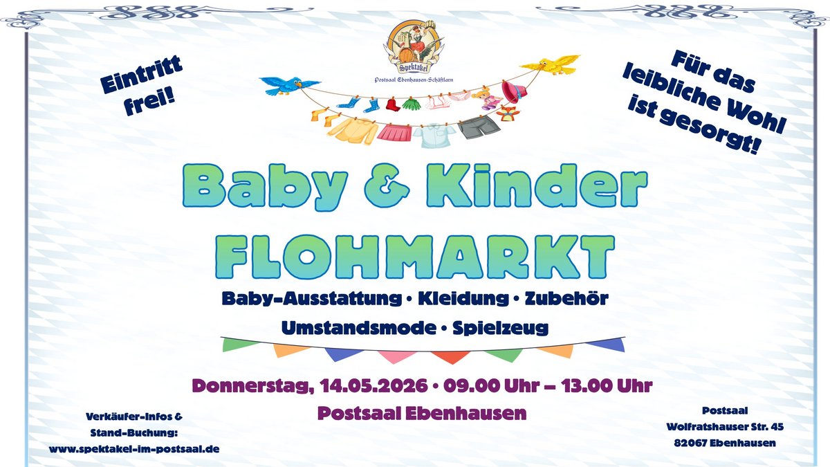 AdresseHogenbergspielplatzHogenbergplatz, 80686 MünchenDie Laimer Schlümpfe veranstalten Ihren Frühlingsflohmarkt am 02. Mai 2026 von 10:00 bis 14:00 Uhr für Ba..weitere InformationenDie Laimer Schlümpfe veranstalten Ihren Frühlingsflohmarkt am 02. Mai 2026 von 10:00 bis 14:00 Uhr für Baby- und Kinderkleidung, Spielsachen und alles andere für die Kleinen. (Bei schlechtem Wetter findet der Flohmarkt alternativ am 23. Mai statt)Details & Kontakt