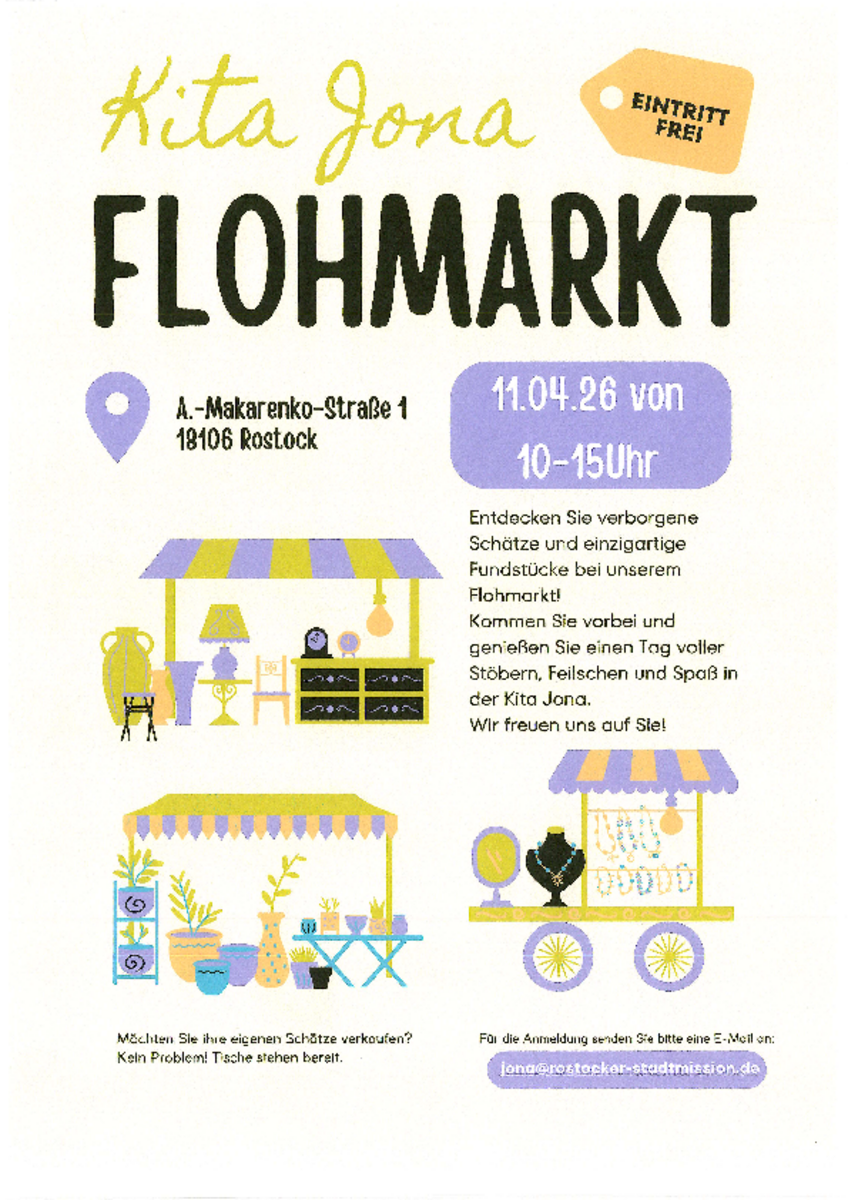 AdresseEvangelische Kita " Jona"Anton Makarenko Str. 1, 18106 Rostock- Evershagen EvershagenIn der evangelischen Kindertagesstätte "Jona" findet unser Flohmarkt statt – und wir freuen uns auf..weitere InformationenIn der evangelischen Kindertagesstätte "Jona" findet unser Flohmarkt statt – und wir freuen uns auf viele Besucher!Details & Kontakt