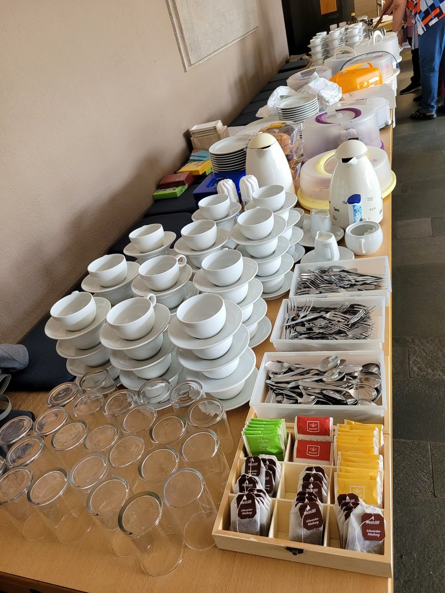 Wir bieten Waffeln, belegte Brötchen und Kaffee an.