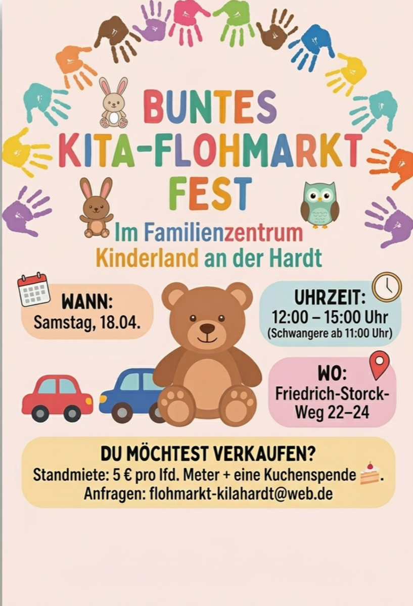 AdresseKinderland an der HardtFriedrich-Storck-Weg 22-24, 42107 Wuppertal (Elberfeld)Kinderflohmarkt im Kinderland an der Hardt am 18.04.26 von 12-15 Uhr. Eintritt für Schwangere ab 11 Uhr...Achtung: Dieser Termin wurde leider abgesagt!Details
