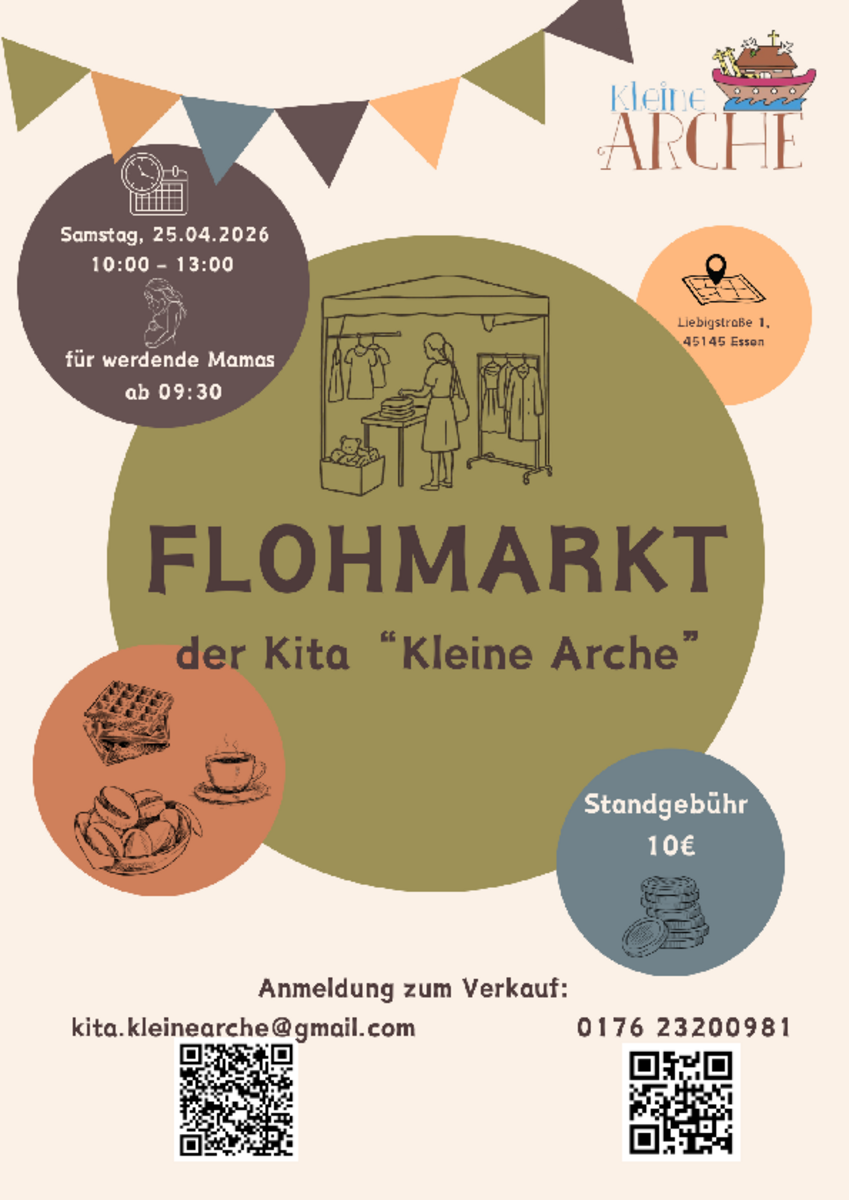 AdresseJulius-Leber-HausMeistersingerstraße 50, 45307 EssenVon 11 bis 14 Uhr gibt es alles rund ums Kind – von Kinderbekleidung über Spielsachen, Bücher und Autosi..weitere InformationenVon 11 bis 14 Uhr gibt es alles rund ums Kind – von Kinderbekleidung über Spielsachen, Bücher und Autositze bis hin zu vielem mehr. An fast 50 Ständen könnt ihr nach Schnäppchen stöbern, euch austauschen und feilschen. Für eine kleine Stärkung gibt es in unserer Cafeteria frisch gebackene Waffeln, Kuchen, Kaffee, Kaltgetränke sowie Würstchen im Brötchen. Die Einnahmen kommen einem guten Zweck im Raum Essen zugute. Wir freuen uns auf euren Besuch! Achtung: Ab diesem Jahr gilt ein neues Anmeldeverfahren. Ab dem 1. des Monats vor dem Flohmarkttermin ist die Anmeldung nur noch online über unsere Mailadresse möglich.Details & KontaktKontakt mit dem Organisator aufnehmen
