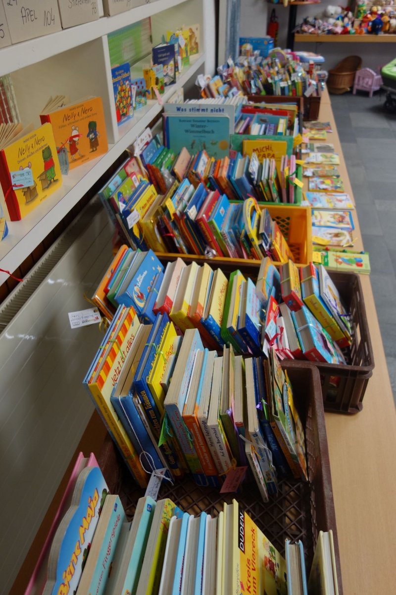 Hochwertige Spielsachen, Kinderwagen, Autositze, Fahrräder, Laufräder und Kinderkleinmöbel runden das vielfältige Angebot ab. Die Käufer genießen die große, nach Themen und Kleidergrößen sortierte Auswahl. Ganz der Idee eines "Second-Hand-Kaufhauses" für Kindersachen folgend kann man nach erfolgreicher Schnäppchenjagd den gesammelten Einkauf an den Kassen bezahlen und zufrieden nach Hause tragen. Vorher wird sich noch in der Cafeteria gestärkt. Für nur 1 Euro pro Kuchenstück, Waffel bzw. Getränk wird der Einkaufstag gefeiert.