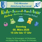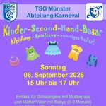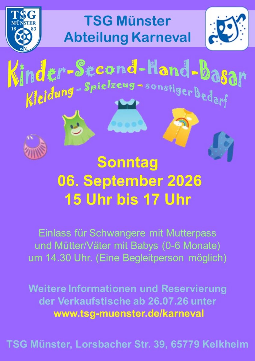 AdresseTSG Münster e.V. 1883Lorsbacher Str. 39, 65779 KelkheimAm Sonntag, den 06. September 2026 findet der nächste Selbstverkäuferbasar für Kinderkleidung, Babybedarf..weitere InformationenAm Sonntag, den 06. September 2026 findet der nächste Selbstverkäuferbasar für Kinderkleidung, Babybedarfsartikel, Bücher, Fahrzeuge und Spielzeug in der TSG Halle statt. Der Erlös aus den Standgebühren und dem Kuchenverkauf kommt der Abteilung Karneval zugute. Einlass für Schwangere mit Mutterpass und Mütter/Väter mit Babys (0-6 Monate) ab 14:30 Uhr. Eine Begleitperson möglich.Details & KontaktKontaktAb dem 26. Juli 2026 haben Sie die Möglichkeit, sich über unser Kontaktformular einen oder auch mehrere Tische zu reservieren. Dort erhalten Sie ebenfalls Informationen über die Standgebühren.