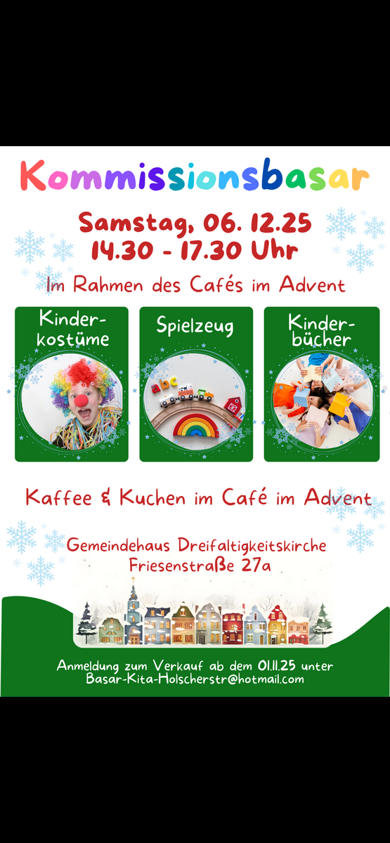 Der Advent steht vor der Tür, jetzt noch schnell Schnäppchen sichern: beim Kommissionsbasar des Fördervereins der Kindertagesstätte Heilig Geist besteht die Möglichkeit, sowohl Kleidung für die kalte Jahreszeit als auch Spielsachen für drinnen/draußen zu erwerben, selbstverständlich gibt es wie immer zusätzlich alles, was Babys und Kinder brauchen, auch Umstandsmode wird angeboten.