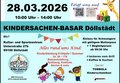 AdresseKultur- und SportzentrumUnterstraße 27b, 99100 DöllstädtDer Kindersachen-Basar in Döllstädt findet am 28.03.2026 von 10:00 bis 14:00 Uhr im Kultur- und Sportzentrum D..weitere InformationenDer Kindersachen-Basar in Döllstädt findet am 28.03.2026 von 10:00 bis 14:00 Uhr im Kultur- und Sportzentrum Döllstädt statt. Angeboten wird alles rund ums Kind – von Frühjahrs- und Sommerkleidung (Größe 50–176) über Babyausstattung, Spielzeug, Kostüme bis hin zu Büchern und vielem mehr. Für das leibliche Wohl ist mit Leckerem vom Grill sowie Kaffee und Kuchen gesorgt. Schwangere mit gültigem Mutterpass erhalten bereits ab 09:30 Uhr Einlass. Als besonderes Highlight erwarten euch eine Tombola und Kinderschminken.Details & KontaktKontakt mit dem Organisator aufnehmen