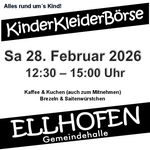 AdresseGemeindehalle EllhofenHauptstraße 21, 74248 EllhofenAm Samstag, 28. Februar 2026, findet die Kinderkleiderbörse von 12:30 Uhr bis 15:00 Uhr in der Gemeindehalle in Ell..weitere InformationenAm Samstag, 28. Februar 2026, findet die Kinderkleiderbörse von 12:30 Uhr bis 15:00 Uhr in der Gemeindehalle in Ellhofen statt. Es werden gebrauchte, aber gut erhaltene Kleidungsstücke, Spielsachen, Kinderwagen, Kinderfahrzeuge und Gebrauchsgegenstände angeboten, außerdem gibt es einen extra Kinderflohmarkt. Für das leibliche Wohl ist ebenfalls bestens gesorgt: Verschiedene Warm- und Kaltgetränke, Kuchen und Torten, Saitenwürstle und Brezeln gibt es zu angenehmen Preisen, gerne auch zum Mitnehmen.Details & Kontakt