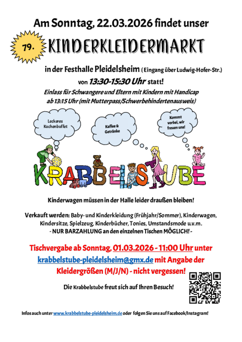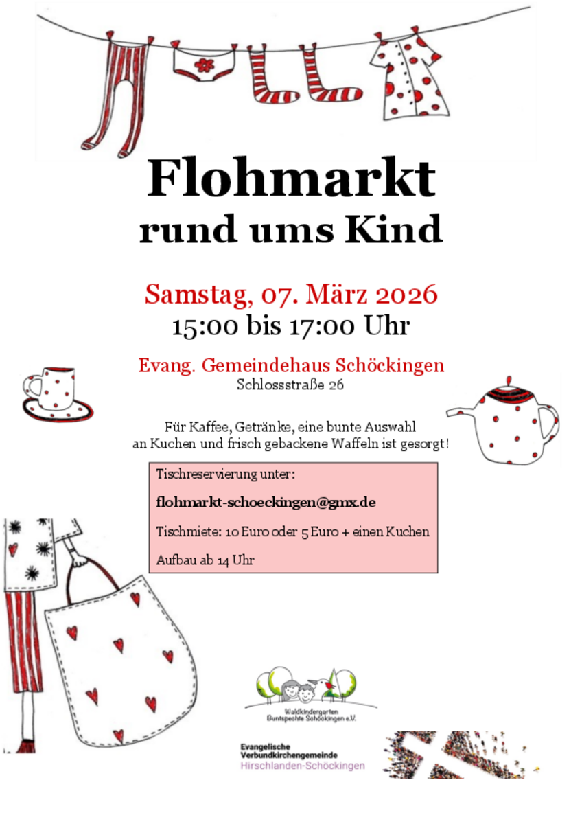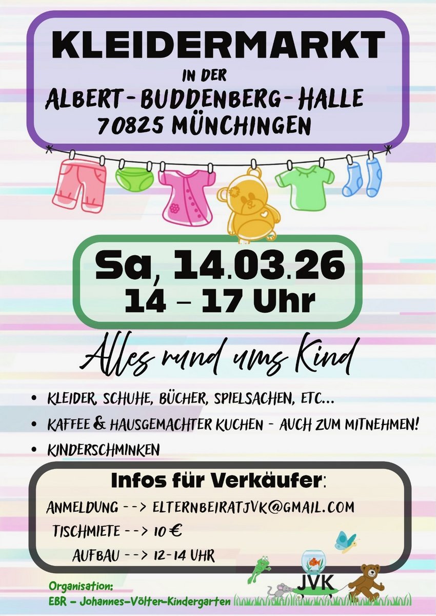 AdresseGemeindehalle LöchgauRiedstraße 3, 74369 LöchgauAm 01.03.2026 findet wieder unser Kinderkleidermarkt in der Gemeindehalle statt. Einlass ist um 14.00 Uhr - Schwangere u..weitere InformationenAm 01.03.2026 findet wieder unser Kinderkleidermarkt in der Gemeindehalle statt. Einlass ist um 14.00 Uhr - Schwangere und Schwerbehinderte mit Ausweis können bereits ab 13.30 Uhr einkaufen. Für das leibliche Wohl sorgen wieder unsere Jugendmannschaften mit Kaffee, selbstgemachten Kuchen, Torten und Waffeln.Details & Kontakt