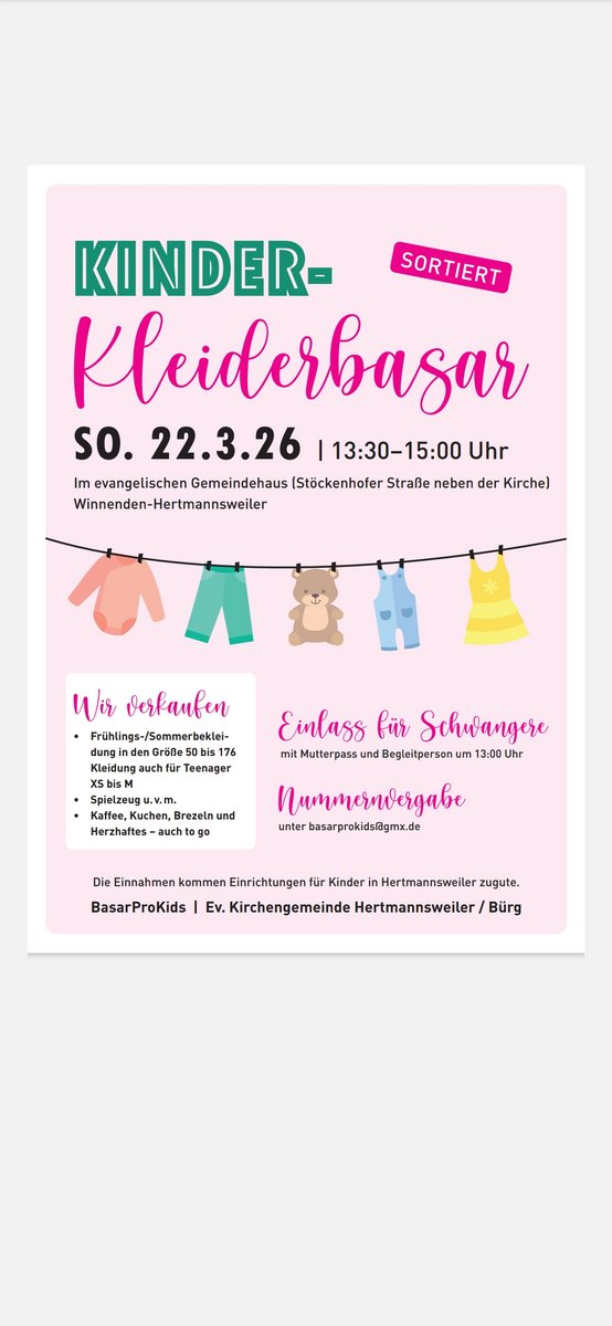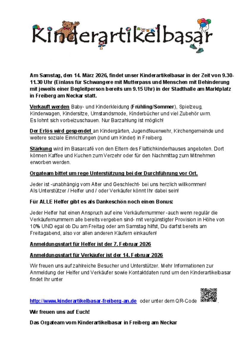 Das Basarteam freut sich immer über neue Gesichter zum Helfen, jeder Helfer/in erhält sicher eine Helfernummer und darf 80 Teile zum Verkauf anbieten.Kontaktwww.sachsenheim-basar.de/Kontakt mit dem Organisator aufnehmen - Kinderkleiderbörse EllhofenGemeindehalle Ellhofen