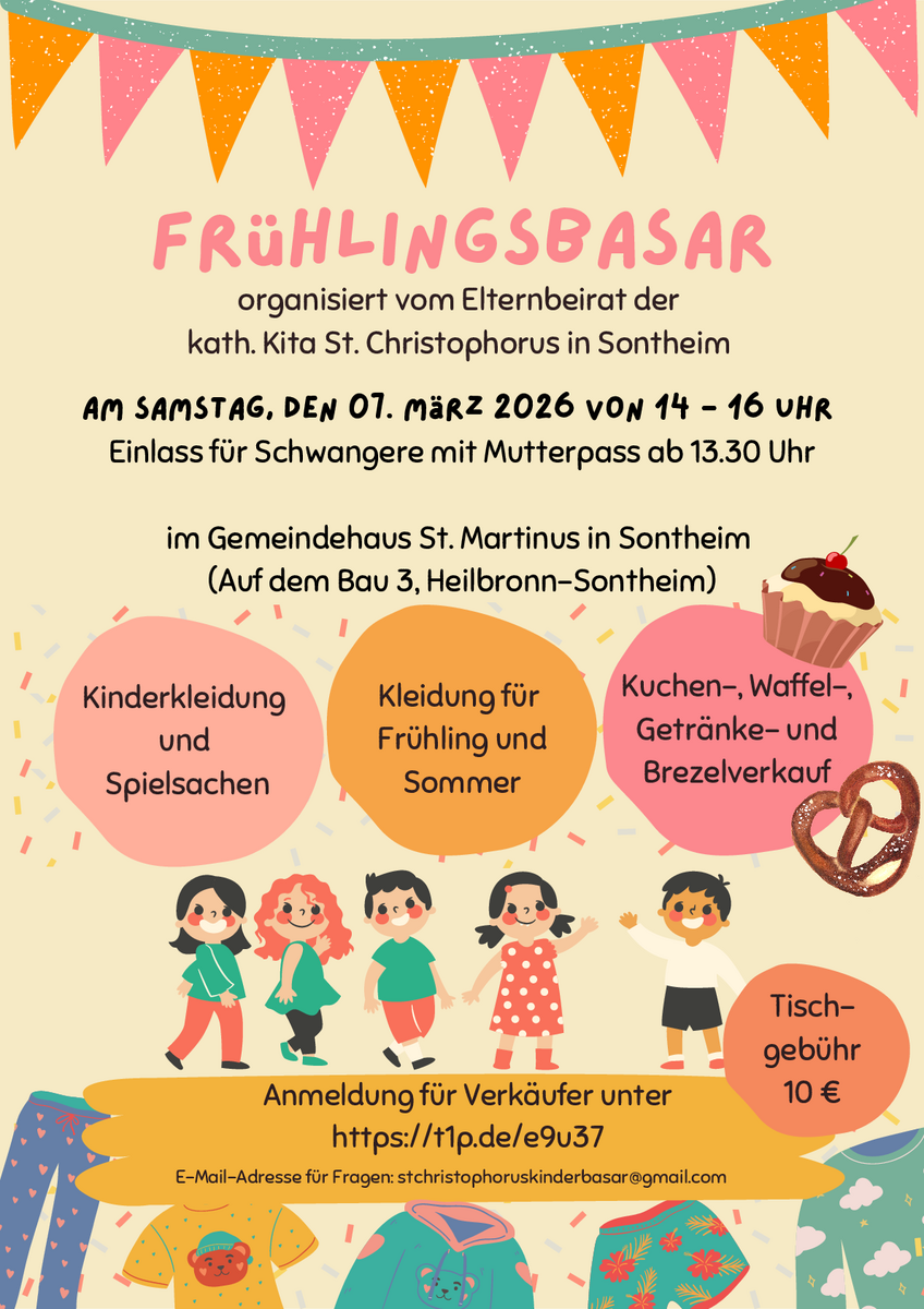 AdresseKinderbasar im Familienzentrum KreuzgrundHolunderweg 57, 74080 Heilbronn Böckingen🧸 Kinderbasar im Familienzentrum Kreuzgrund 🧸 Am 28. Februar 2026 ist es wieder so weit: Wir laden euch herzlic..weitere Informationen🧸 Kinderbasar im Familienzentrum Kreuzgrund 🧸Details & Kontakt