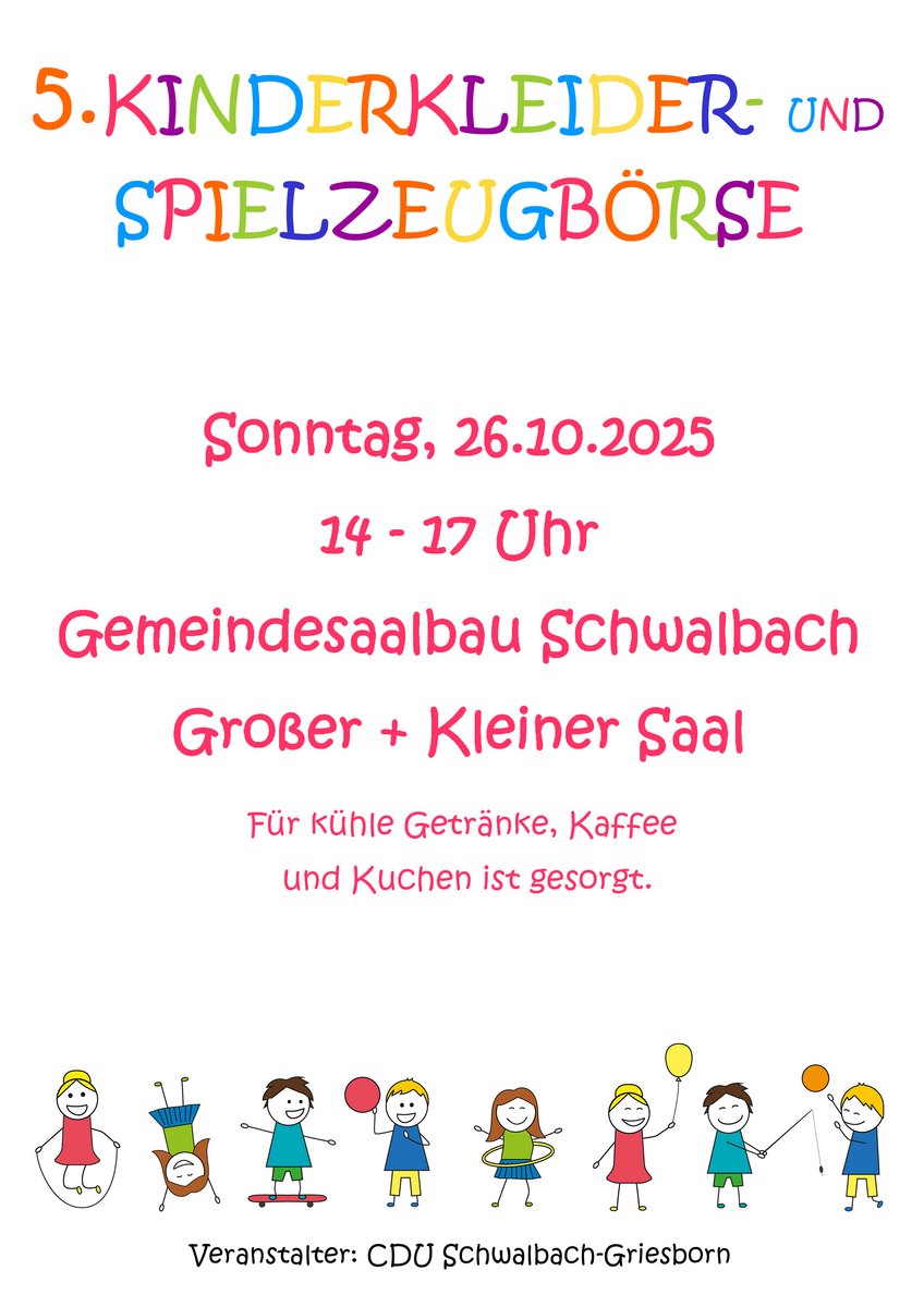AdresseGemeindesaalbau SchwalbachHauptstraße 90, 66773 SchwalbachAm Sonntag, den 26. Oktober 2025, lädt die CDU Schwalbach-Griesborn von 14:00 bis 17:00 Uhr zur 5. Kinderkleider- u..weitere InformationenAm Sonntag, den 26. Oktober 2025, lädt die CDU Schwalbach-Griesborn von 14:00 bis 17:00 Uhr zur 5. Kinderkleider- und Spielzeugbörse in den Saalbau nach Schwalbach ein.Details & Kontakt