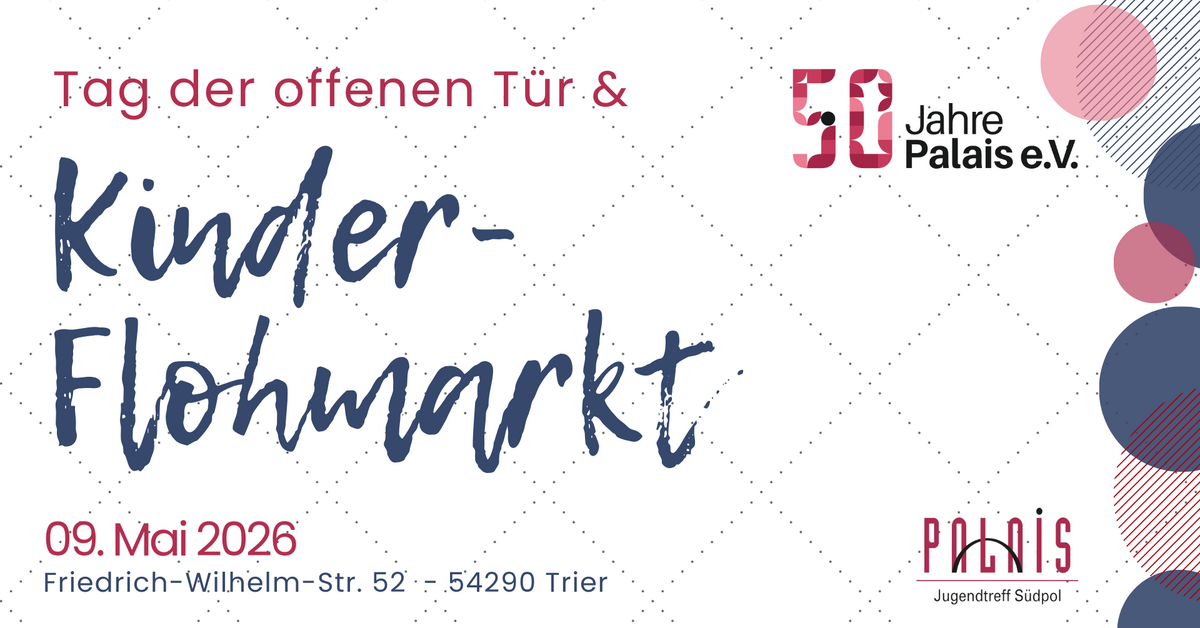 AdresseJugendtreff SüdpolFriedrich-Wilhelm-Str. 52, 54290 TrierMit einem Kinder- und Jugendflohmarkt, kreativen Angeboten und Spielaktionen lädt der Jugendtreff Südpol am Sa..weitere InformationenMit einem Kinder- und Jugendflohmarkt, kreativen Angeboten und Spielaktionen lädt der Jugendtreff Südpol am Samstag, 09. Mai, Kinder, Jugendliche und Familien auf den Schulhof der Grundschule Barbara ein. Anlass ist das 50-jährige Bestehen des Palais e.V., der seit einem halben Jahrhundert Kinder, Jugendliche und Familien in Trier begleitet und unterstützt. Von 11 bis 16 Uhr können junge Trödler*innen ihre gut erhaltenen Bücher, Spiele, Kleidung und andere Lieblingsstücke anbieten. Die Teilnahme am Flohmarkt ist kostenfrei, der Verkauf erfolgt spendenbasiert. Stände können kurzfristig angemeldet werden; benötigt werden lediglich eine Decke oder ein Tisch.Details & Kontakt