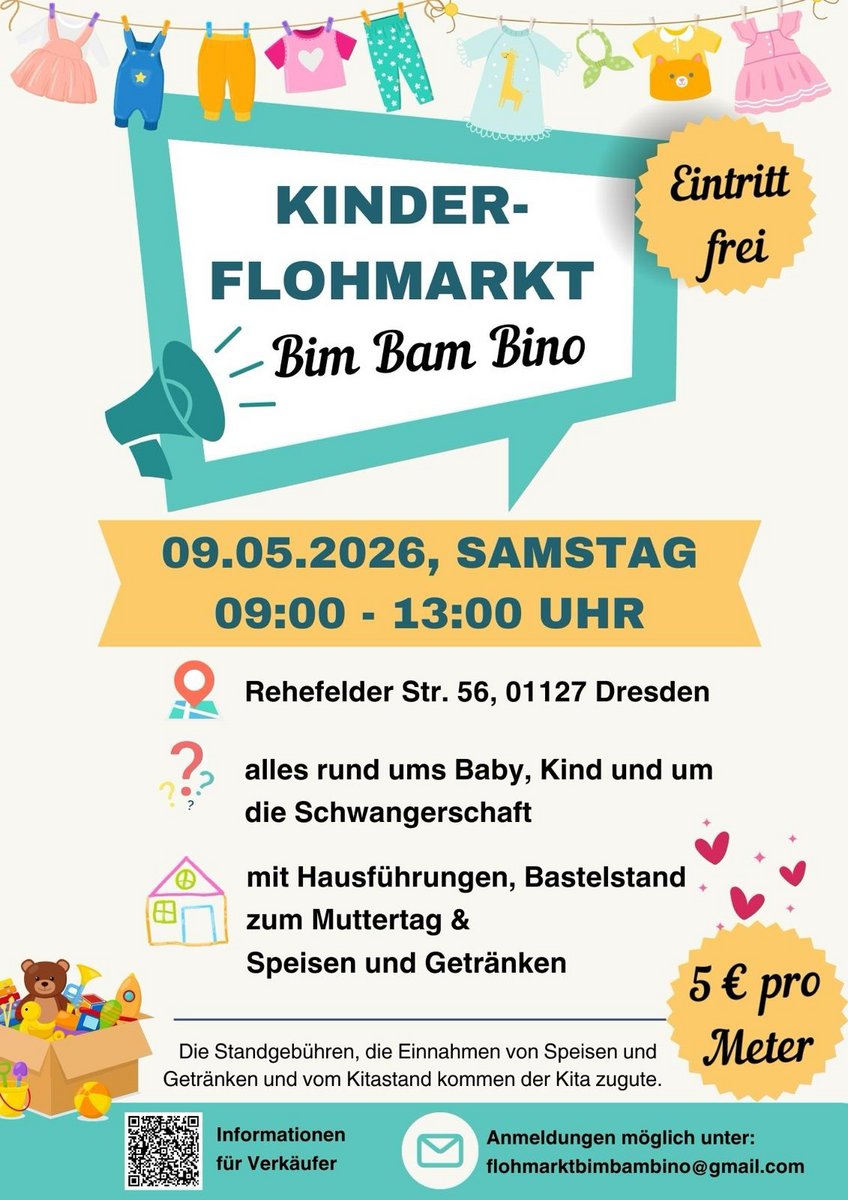 AdresseKita Trachauer SpatzennestGeblerstraße 20, 01139 Dresden (Trachau)Sei herzlich eingeladen zu unserem Frühlingsflohmarkt und freu dich auf Baby- und Kinderkleidung, vielfältiges..weitere InformationenSei herzlich eingeladen zu unserem Frühlingsflohmarkt und freu dich auf Baby- und Kinderkleidung, vielfältiges Spielzeug und vieles mehr! Für dein leibliches Wohl ist mit einem Kuchenbasar und leckerer Bratwurst gesorgt.Details & Kontakt