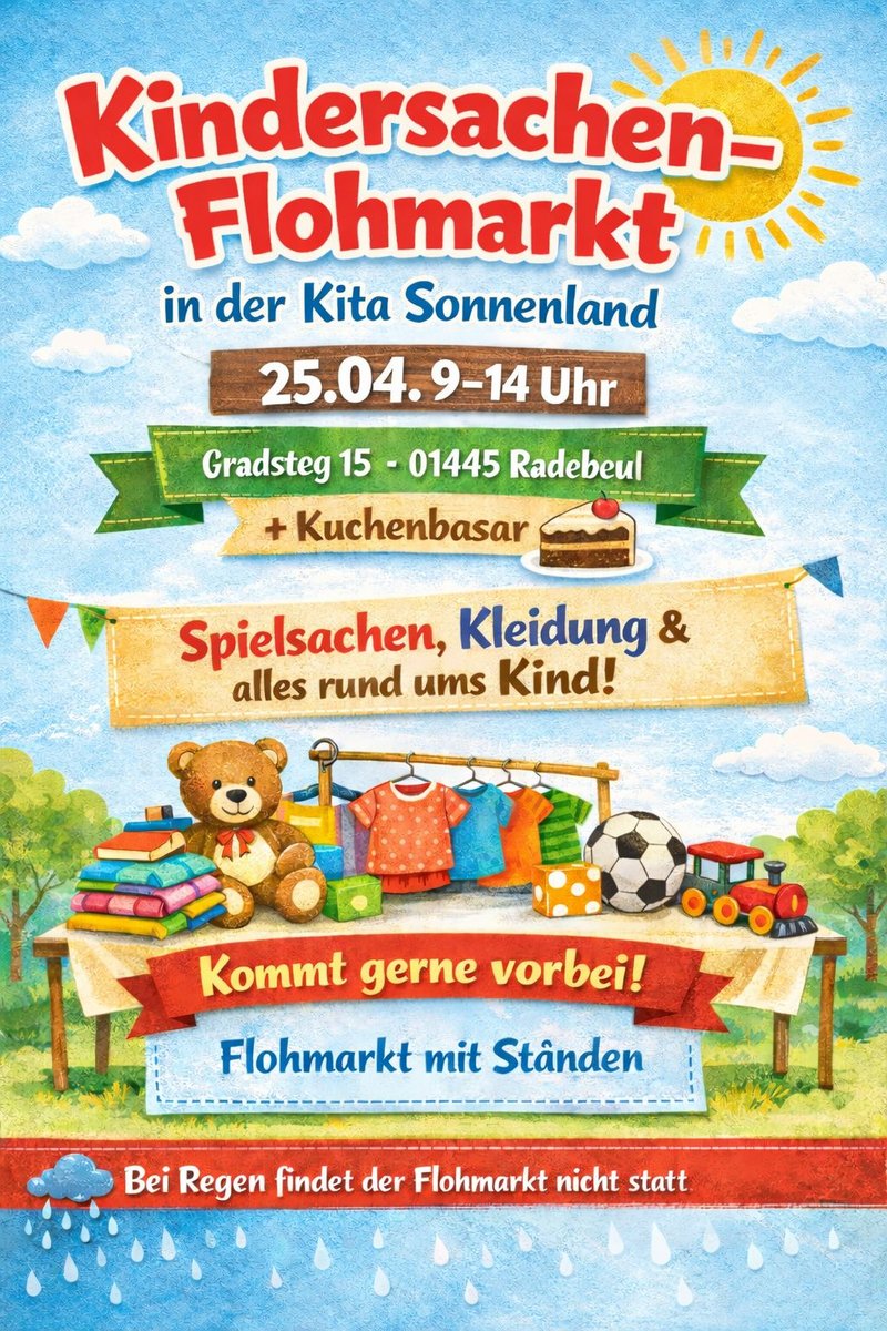 AdresseKita SonnenlandGradsteg 15, 01445 RadebeulWir laden herzlich zum Kindersachenflohmarkt im Hof unserer Kita Sonnenland ein. Es wird einige Stände mit Kindersp..weitere InformationenWir laden herzlich zum Kindersachenflohmarkt im Hof unserer Kita Sonnenland ein. Es wird einige Stände mit Kinderspielzeug, Kleidung und Co. geben.Details & Kontakt