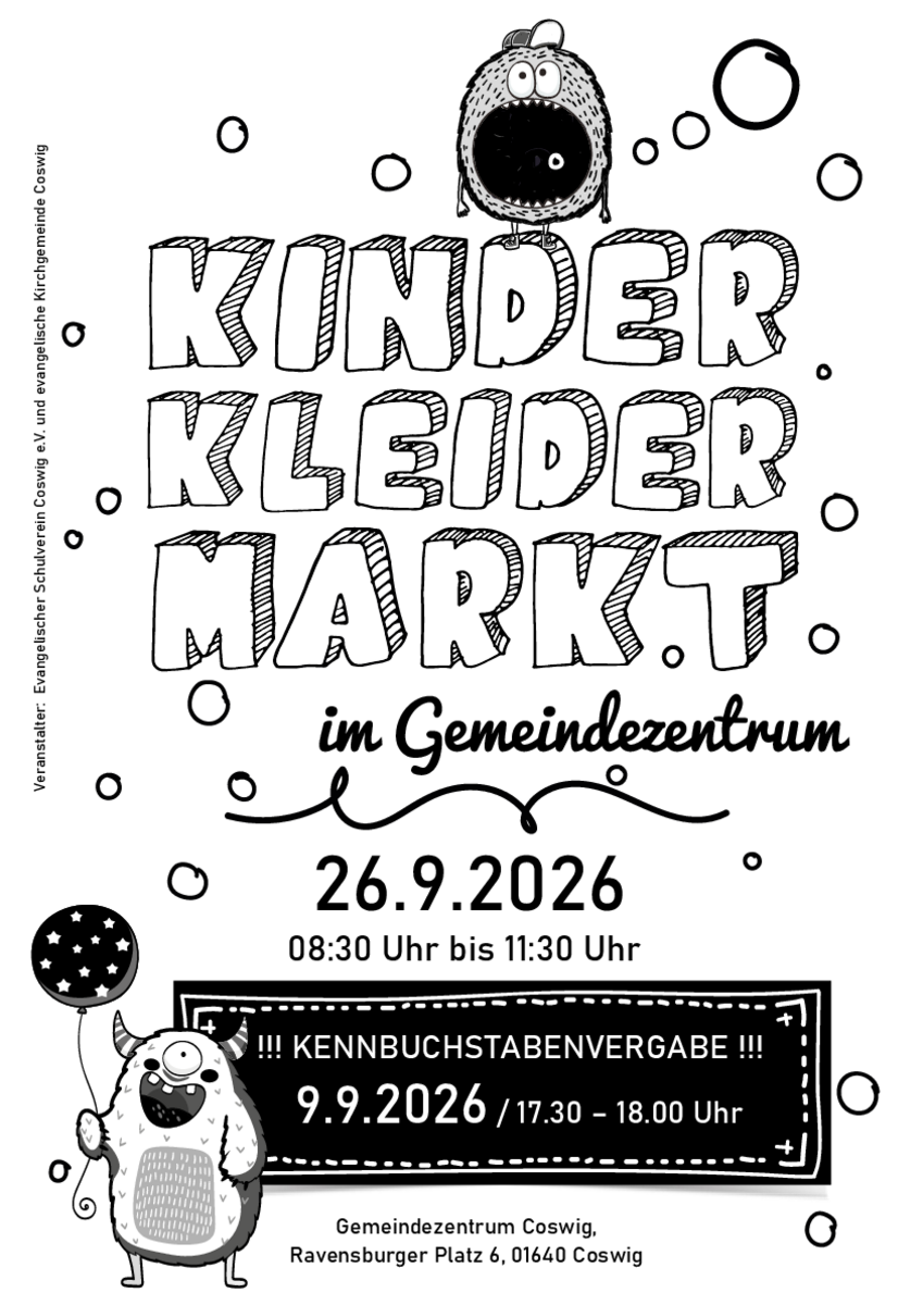 Adresse5. KikiBö - Kleidersachenbörse KitzscherBornaer Str. 21, 04567 KitzscherAm 26. April 2026 findet die mittlerweilefünfte KiKiBÖ – die Kleidersachenbörse in Kitzscher&n..weitere InformationenAm 26. April 2026 findet die mittlerweilefünfte KiKiBÖ – die Kleidersachenbörse in Kitzscher statt! Im Rittersaalund auf der Parkfläche davor gibt es von 12 bis 16 Uhr die Gelegenheit, gut erhaltene Kinderkleidung, Spielwaren, Bücher, CDs sowiegrößere Artikel wie Kinderwagen, Hochstühle oder Spielküchen zu kaufenoder zu verkaufen.Details & Kontakt