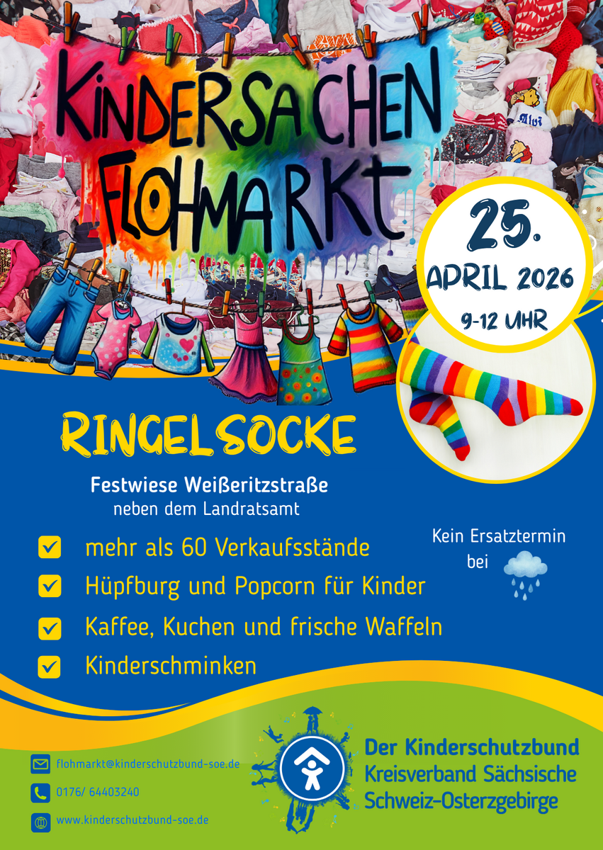 Meldet euch bis 23.04.26 als Verkäufer an oder kommt zum Stöbern und Kaufen vorbei.Kontakt mit dem Organisator aufnehmen - Flohmarkt RingelsockeDt. Kinderschutzbund KV Sächsische Schweiz - Osterzgebirge - Festwiese Weißeritzstraße neben LRA