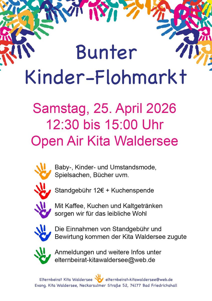 AdresseSport- Und Kulturhalle HähnleinMarktstraße 3, 64665 Alsbach-HähnleinFlohmarkt des EB der Kita Sandwiese, Einlass für Schwangere 13:30, Gebühr 5 Euro + Kuchenspende oder 10 Euro, ..weitere InformationenFlohmarkt des EB der Kita Sandwiese, Einlass für Schwangere 13:30, Gebühr 5 Euro + Kuchenspende oder 10 Euro, Anmeldung über eb-kitadandwiese@web.de, Parkmöglichkeiten auf dem MarktplatzDetails & KontaktKontakteb-kitadandwiese@web.de - KinderflohmarktKinderhaus Vogelstang - im Hof