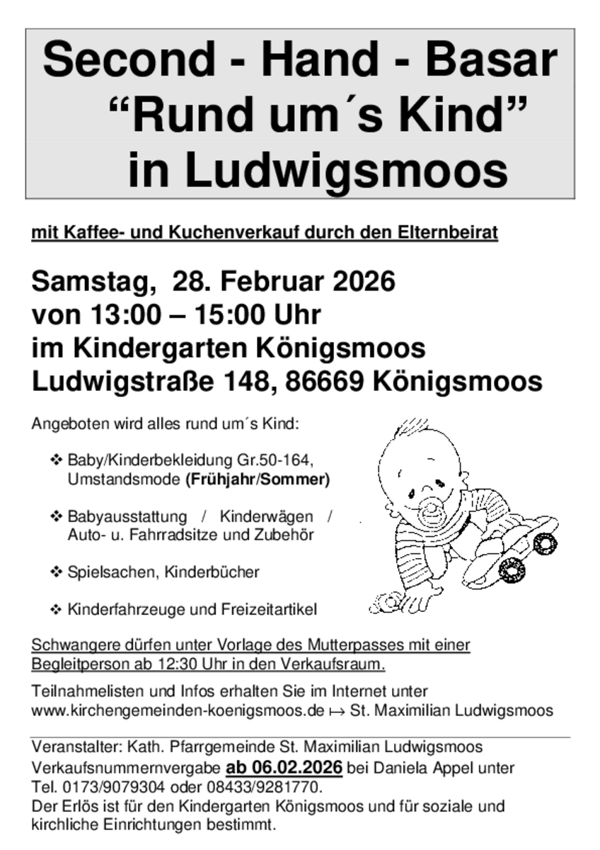 Schwangere dürfen unter Vorlage des Mutterpasses mit einer Begleitperson ab 12.30 Uhr in den Verkaufsraum. Zur Stärkung bietet der Elternbeirat Kaffee und Kuchen für Sie an.KontaktVeranstalter: Kath. Pfarrgemeinde St. Maximilian Ludwigsmoos