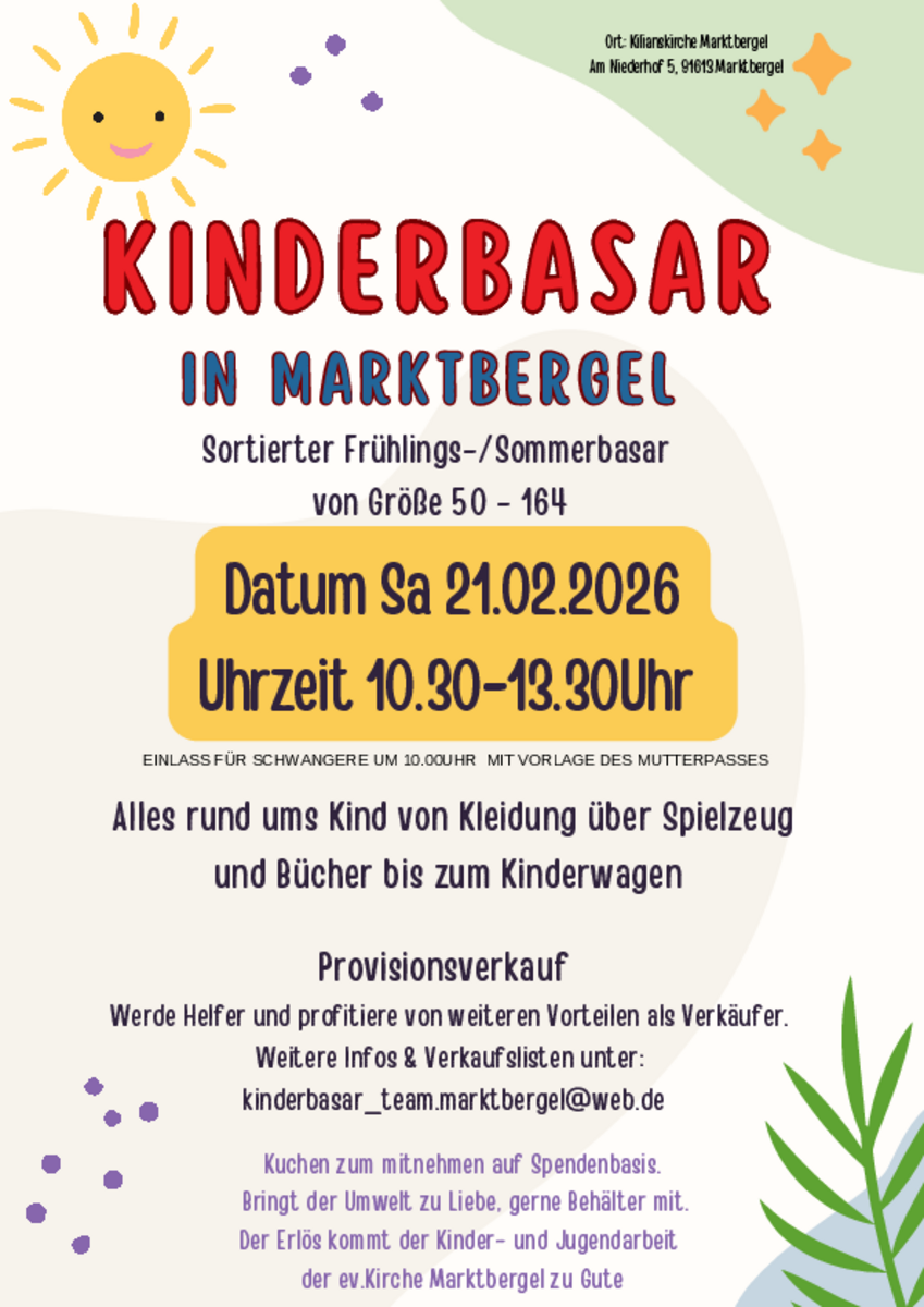 AdresseGemeindehaus St.Kilian MarktbergelAm Niederhof 5, 91613 MarktbergelWir veranstalten einen vorsortierten Frühlings- und Sommerbasar von Größe 50 bis 164, Schuhgrö&szli..weitere InformationenWir veranstalten einen vorsortierten Frühlings- und Sommerbasar von Größe 50 bis 164, Schuhgröße bis 36.Details & Kontakt