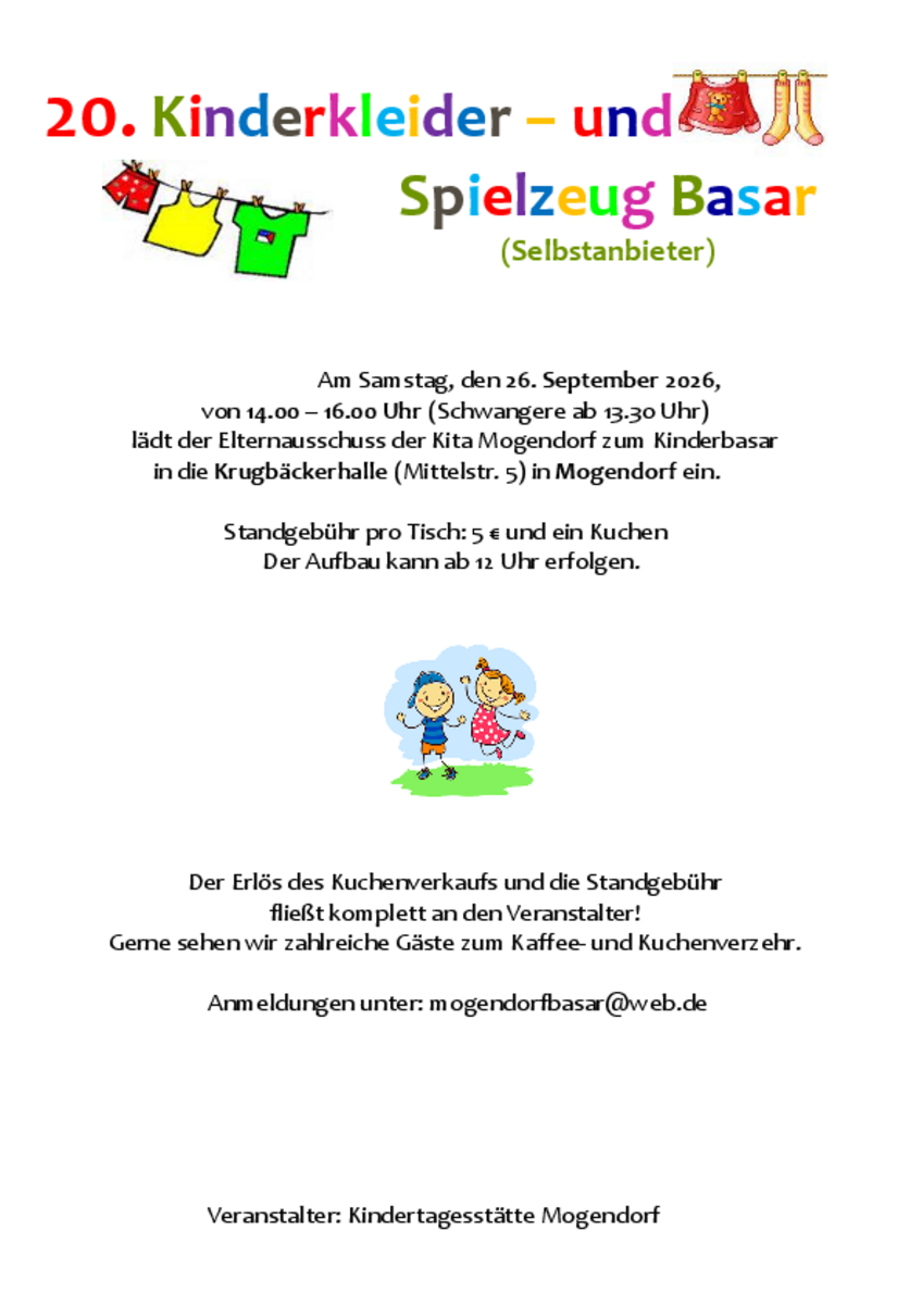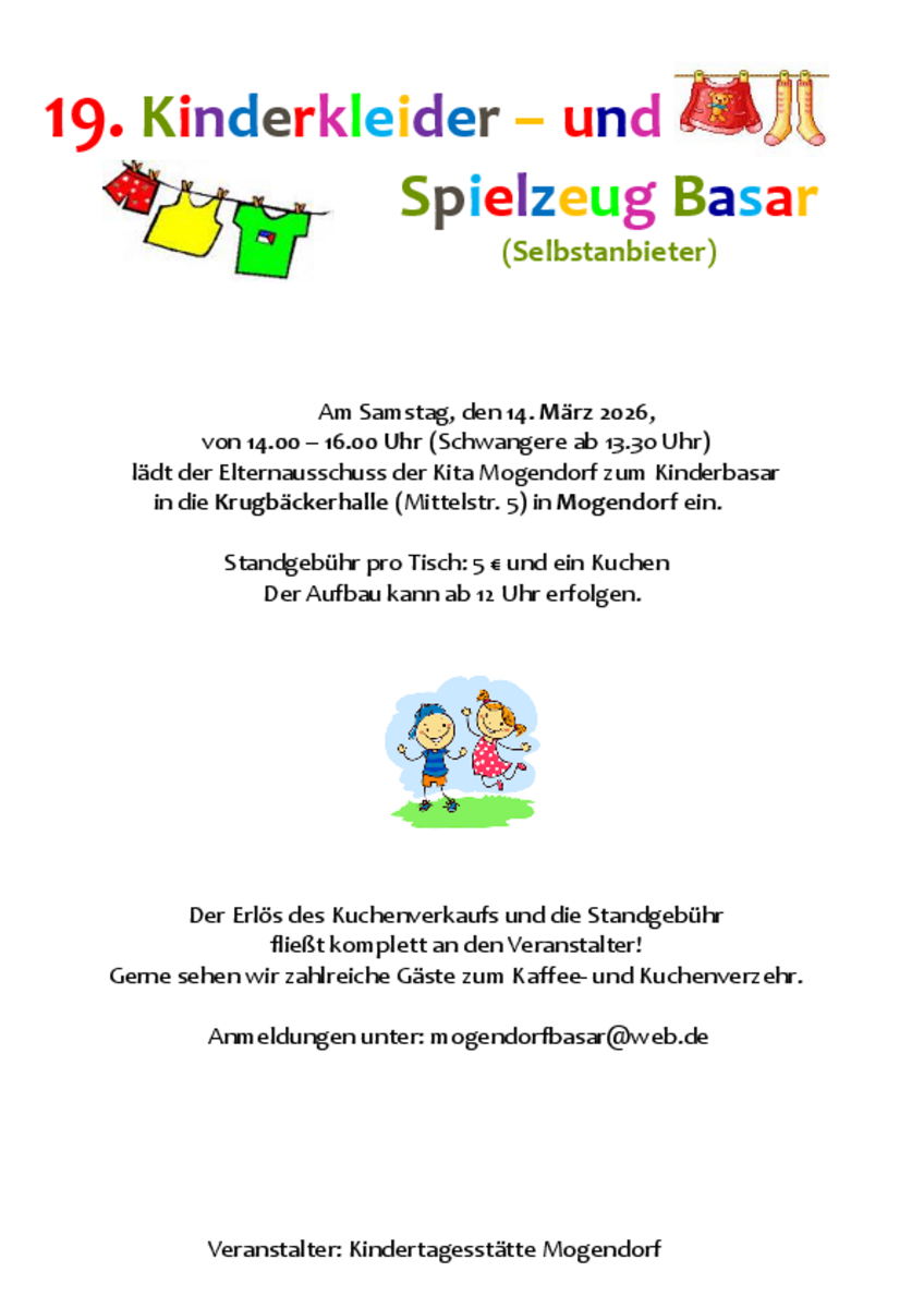 Der Erlös geht an Projekte für die Kinder in der Gemeinde. Dieses Jahr unterstützen wir die Finanzierung eines Multifunktionsplatzes.KontaktKinderbasar.nievern@web.de - Kleiderbasar Frühling/SommerHummerichhalle Plaidt