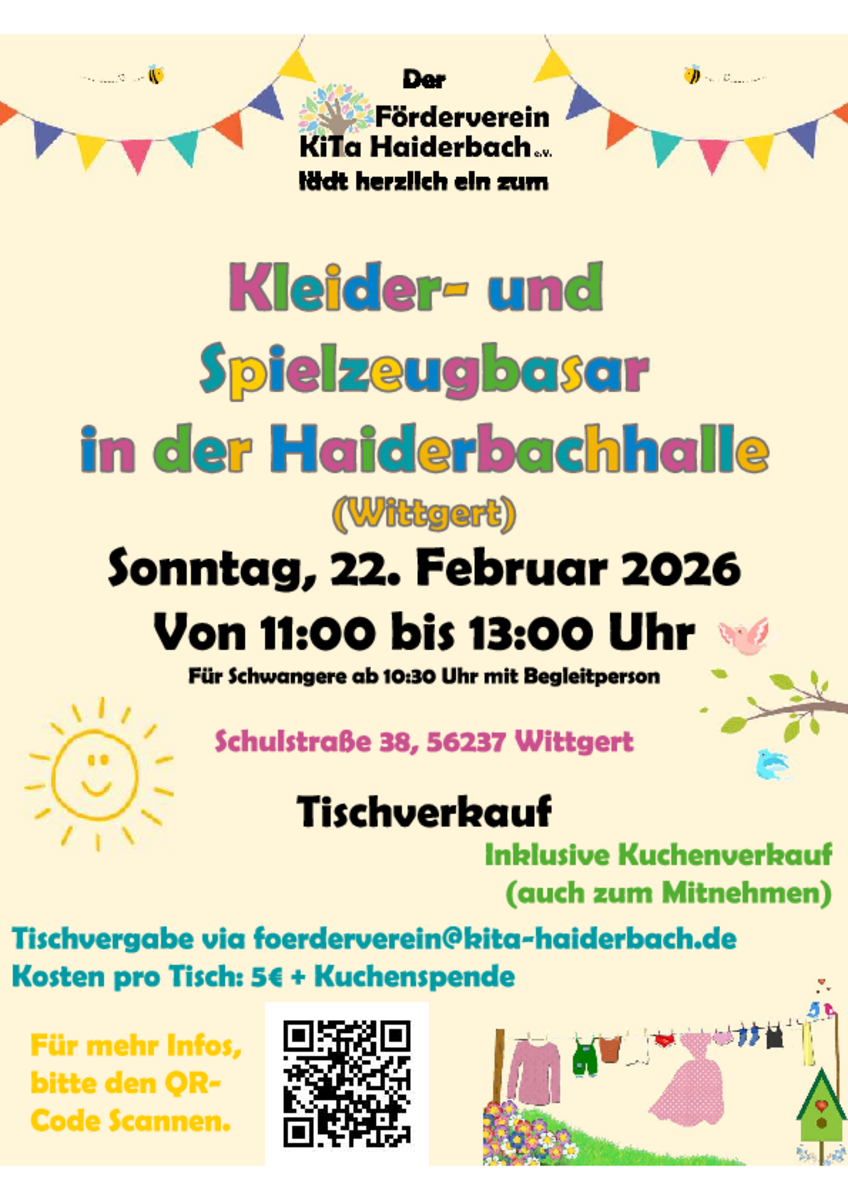 AdresseBaby- und Kinderbasar in der HaiderbachhalleSchulstraße 38, 56237 WittgertTischverkauf Kosten pro Tisch: 5€ + Kuchenspende..weitere InformationenTischverkaufDetails & Kontakt