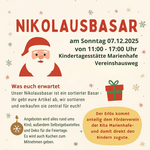 AdresseKindertagesstätte MarienhafeVereinshausweg, 26529 OsteelUnser Nikolausbasar ist ein sortierter Basar – das heißt: Ihr gebt eure Artikel ab, wir sortieren und verkau..weitere InformationenUnser Nikolausbasar ist ein sortierter Basar – das heißt: Ihr gebt eure Artikel ab, wir sortieren und verkaufen sie zentral für euch.Es wird alles rund ums Kind angeboten, außerdem selbstgebasteltes und auch Deko für die Feiertage.Der Erlös kommt anteilig dem Förderverein der Kita Marienhafe und damit den Kindern zugute.Details