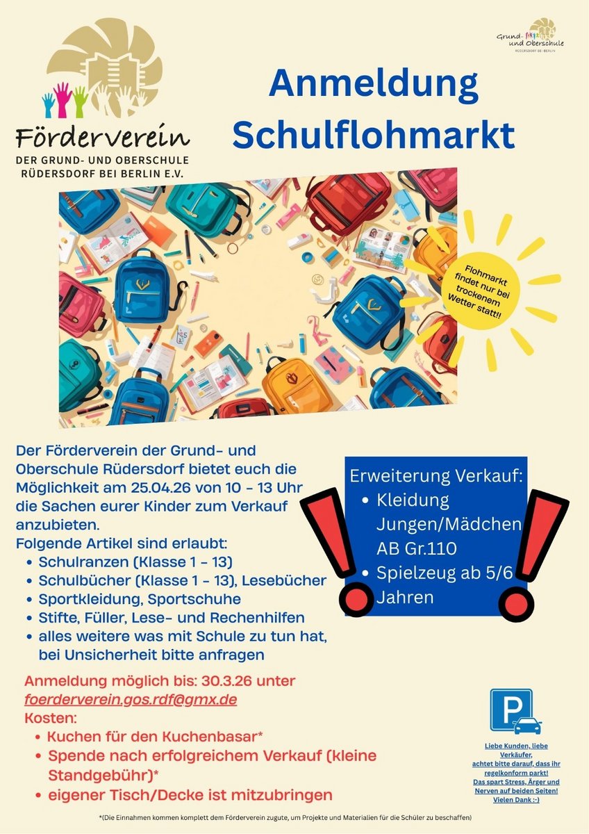 AdresseGrund- und Oberschule RüdersdorfBrückenstr. 79a, 15562 RüdersdorfWir veranstalten den ersten Schulflohmarkt der Grund- und Oberschule Rüdersdorf. Wann? 25.04.26, 10 - 13 Uhr W..weitere InformationenWir veranstalten den ersten Schulflohmarkt der Grund- und Oberschule Rüdersdorf.Details & Kontakt