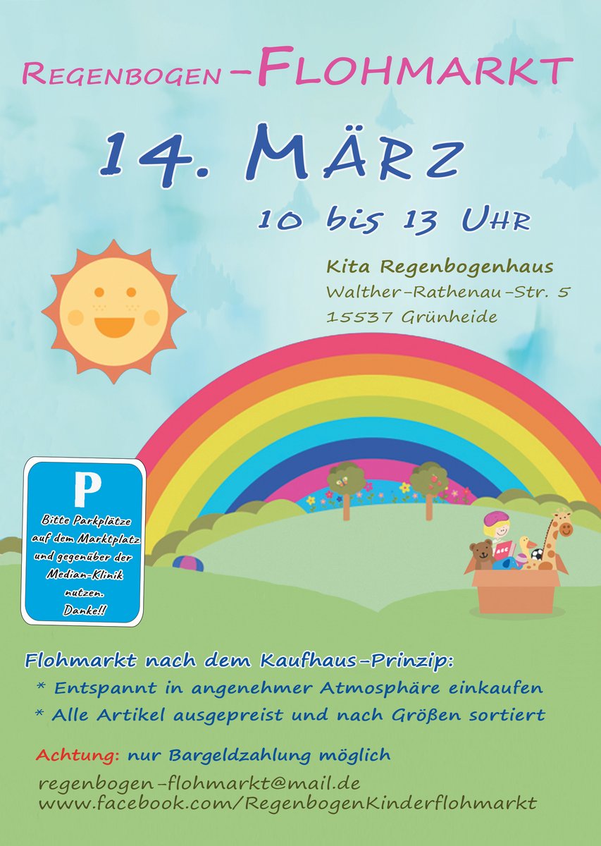 AdresseKita RegenbogenhausWalther-Rathenau-Straße 5, 15537 GrünheideZum 13. Mal findet in den Räumen der Kita Regenbogenhaus in der Walther-Rathenau-Str. 5 in Grünheide durch ein..weitere InformationenZum 13. Mal findet in den Räumen der Kita Regenbogenhaus in der Walther-Rathenau-Str. 5 in Grünheide durch eine Elterninitiative der Regenbogen-Flohmarkt zwischen 10 und 13 Uhr nach Kaufhaus-Prinzip statt.Details & Kontakt