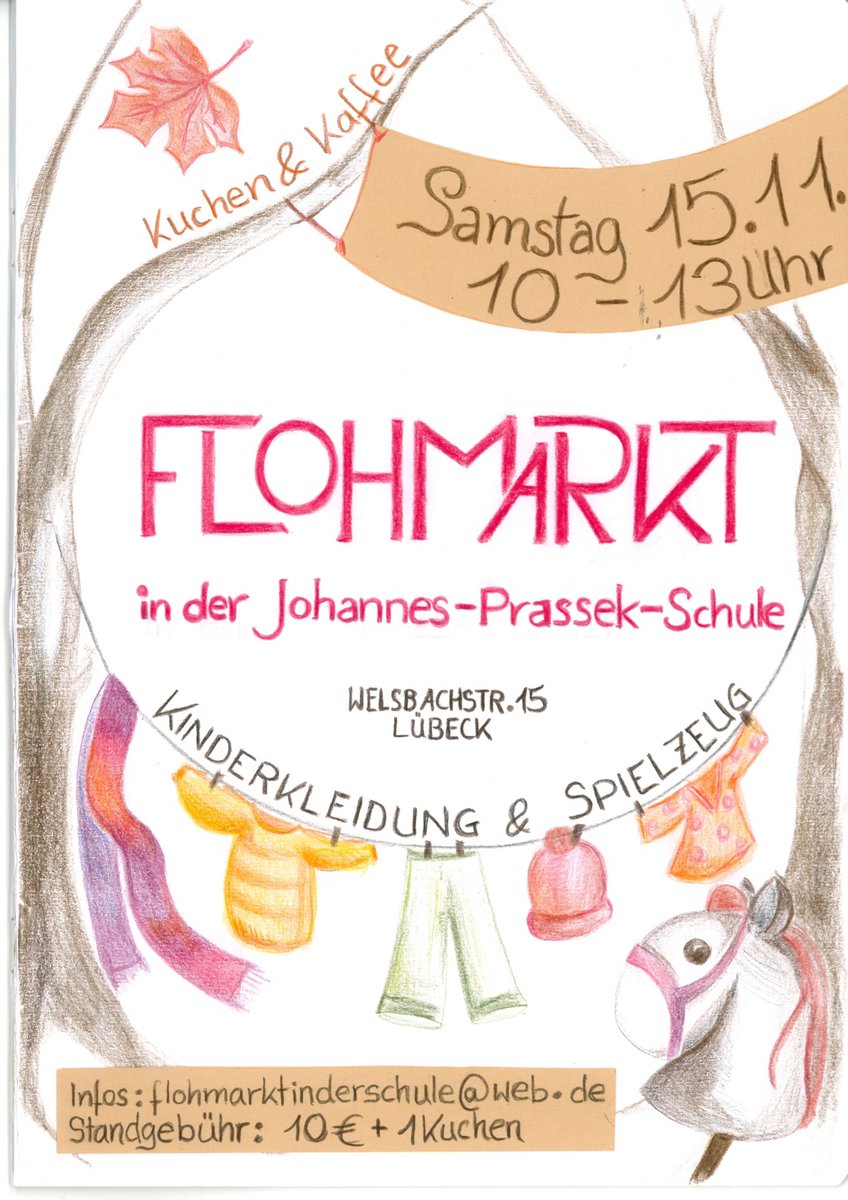 AdresseJohannes-Prassek-SchuleWelsbachstraße 15, 23560 LübeckDie Johannes-Prassek-Schule veranstaltet einen großen Flohmarkt rund ums Kind. Angeboten werden Kinderkleidung, Sp..weitere InformationenDie Johannes-Prassek-Schule veranstaltet einen großen Flohmarkt rund ums Kind. Angeboten werden Kinderkleidung, Spielzeug, Bücher, CDs und vieles mehr. Es gibt Kuchen und Kaffee.Details & KontaktKontaktDie Anmeldegebühr pro Tisch (bis zu 3m) beträgt 10 Euro plus eine Kuchenspende.