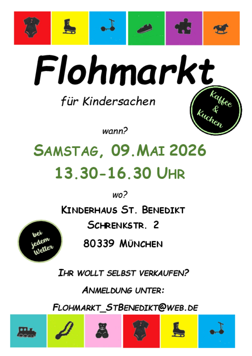 AdresseHogenbergspielplatzHogenbergplatz, 80686 MünchenDie Laimer Schlümpfe veranstalten Ihren Frühlingsflohmarkt am 02. Mai 2026 von 10:00 bis 14:00 Uhr für Ba..weitere InformationenDie Laimer Schlümpfe veranstalten Ihren Frühlingsflohmarkt am 02. Mai 2026 von 10:00 bis 14:00 Uhr für Baby- und Kinderkleidung, Spielsachen und alles andere für die Kleinen. (Bei schlechtem Wetter findet der Flohmarkt alternativ am 23. Mai statt)Details & Kontakt
