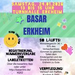 Am 24.01.2026findet in Erkheim der Basar in der Turn- und Festhalle von 13 bis 15 Uhr mit Kaffee und Kuchenverkauf statt.