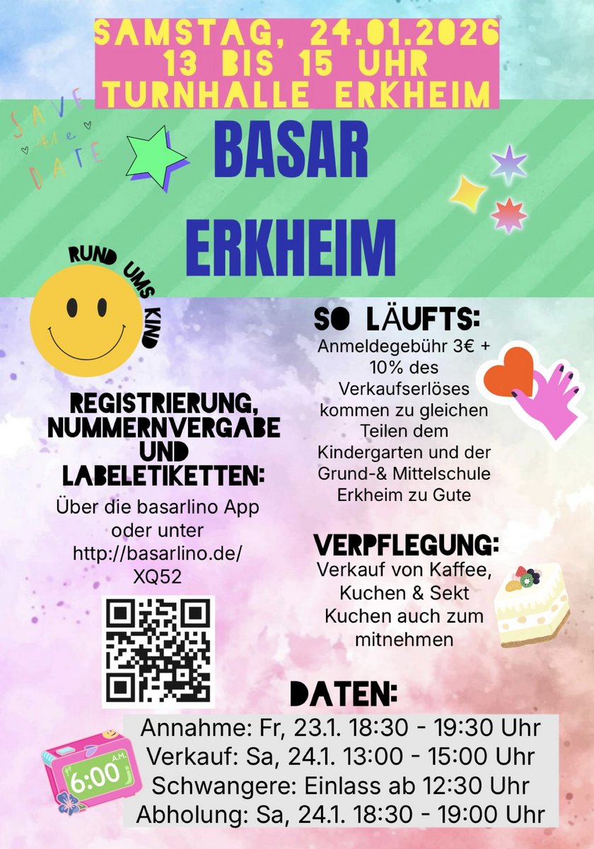 AdresseBasar rund ums Kind ErkheimSchulweg 1, 87746 Erkheim ErkheimBasar rund ums Kind in Erkheim Am 24.01.2026findet in Erkheim der Basar in der Turn- und Festhalle von 13 bis 15 Uhr ..weitere InformationenBasar rund ums Kind in ErkheimDetails & Kontakt