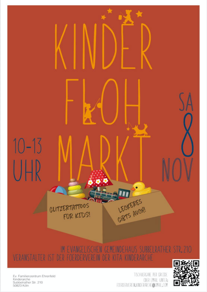 AdresseKita KinderarcheSubbelrather Str 206-210, 50823 Köln Neu-EhrenfeldAm 8. November von 10:00 bis 15:00 Uhr findet in der Ev. Kita Kinderarche ein bunter Kinderflohmarkt statt. Verkauft wer..weitere InformationenAm 8. November von 10:00 bis 15:00 Uhr findet in der Ev. Kita Kinderarche ein bunter Kinderflohmarkt statt. Verkauft werden Kinderkleidung, Kinderschuhe, Kinderausstattung, Spiele, Bücher, Spielzeug und sicher noch einige andere Schätze.Details & Kontakt