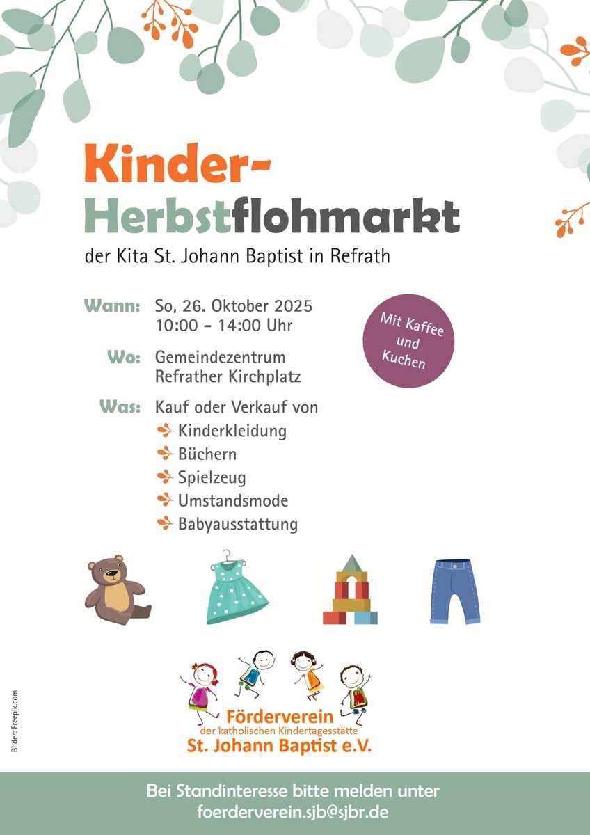 AdresseRefrathKirchplatz 18, 51427 Bergisch Gladbach (Refrath)Herbstflohmarkt für Kinderkleidung und mehr! Kauf und Verkauf bei Kaffee und Kuchen..weitere InformationenHerbstflohmarkt für Kinderkleidung und mehr!Details & Kontakt