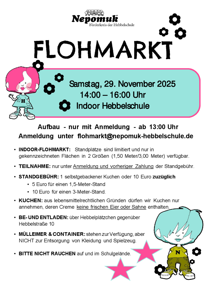 Anmeldung ab sofort unter: flohmarkt@nepomuk-hebbelschule.deKontakt mit dem Organisator aufnehmen